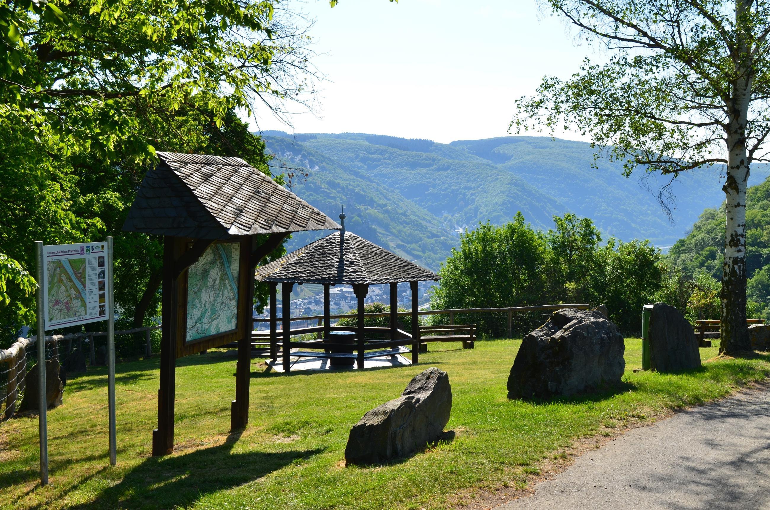 Wunderbarer Rastplatz mit einigen Sitzmöglicheiten, Tischen und überdachtem Pavillion. Grandioser Blick auf den Rhein, Burg Gutenfels mit Kaub und Burg Pfalzgrafenstein im Rhein. Großer Parkplatz von der K 89 ca. 50 m entfernt. Direkt am RheinBurgenWeg gelegen. Auch eine Startmöglichkeit des Traumschleifchens "Pfalzblick".