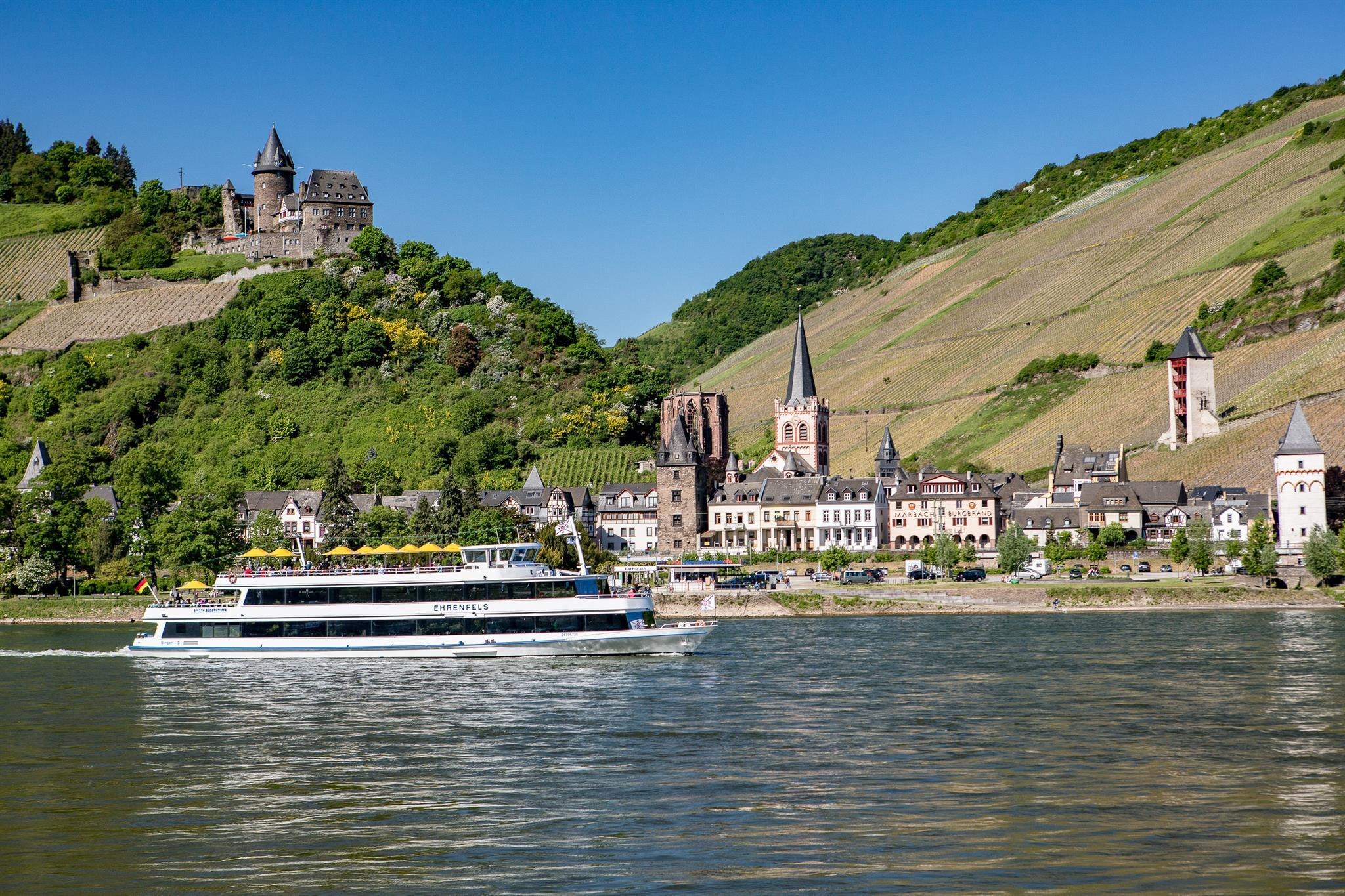 Fahrten rund um das Binger Loch, vorbei an Mäuseturm, Ruine Ehrenfels, Burg Rheinstein und Reichenstein, nach St. Goarshausen, Kaub und Bacharach sind im Fahrplan enthalten.
