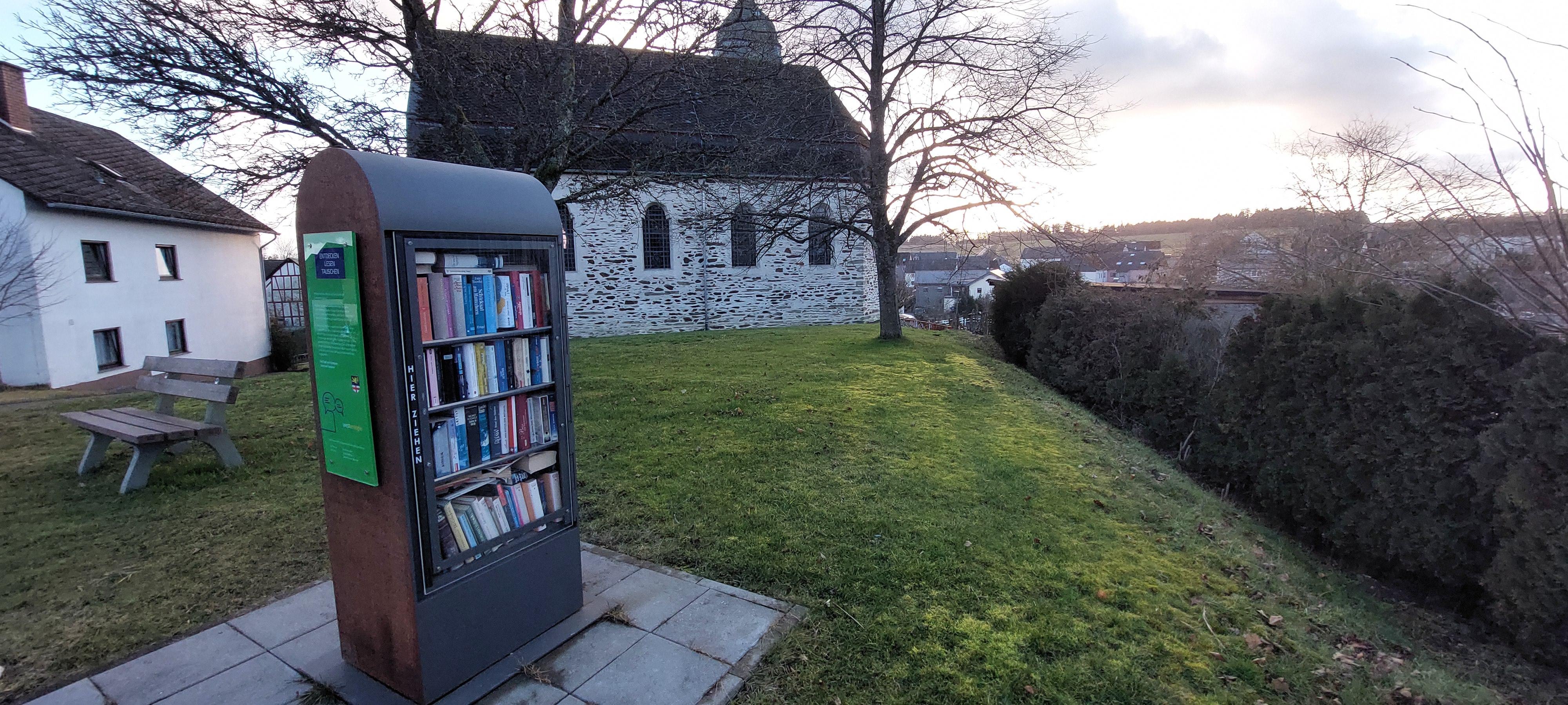 Bücherschrank in Laudert am Kroppenberg auf dem Vorplatz an der kath. Kirche.
