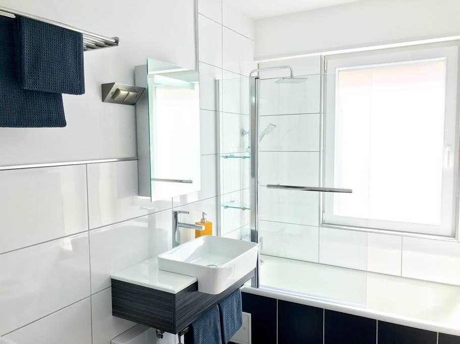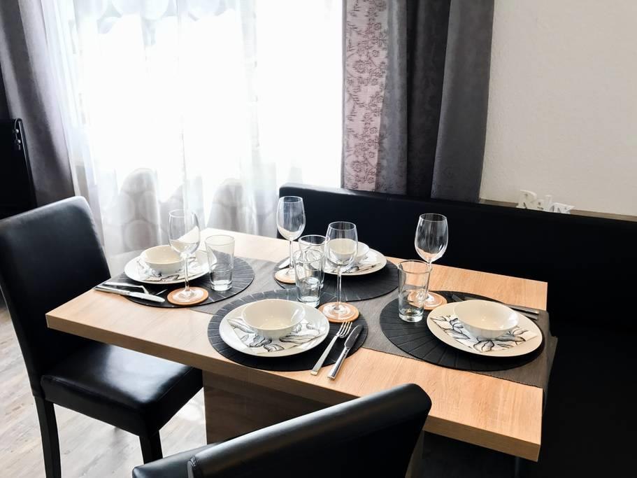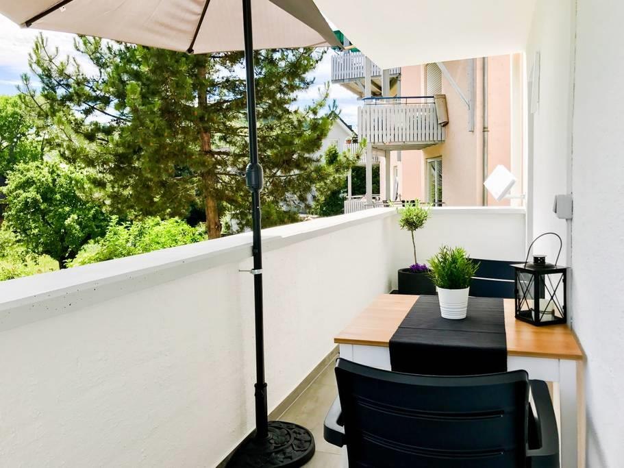 Unsere Ferienwohnung liegt nah am Wasser: In 200 Metern erreichen Sie den Rhein. Ganz in der Nähe finden Sie zudem alle Läden des täglichen Bedarfs – vom Traditionsmetzger bis hin zur Backstube, wo jeden Tag frisch gebackenes Brot auf Sie wartet. Doch bekanntlich kommt es vor allem auf die inneren Werte an: Knapp 60 m2 Wohnfläche bieten ausreichend Platz für bis zu fünf Personen. Hinzu kommt ein schöner Südbalkon mit Blick ins Grüne. Hier können Sie je nach Wetter gemütlich frühstücken, grillen oder Sonne tanken.