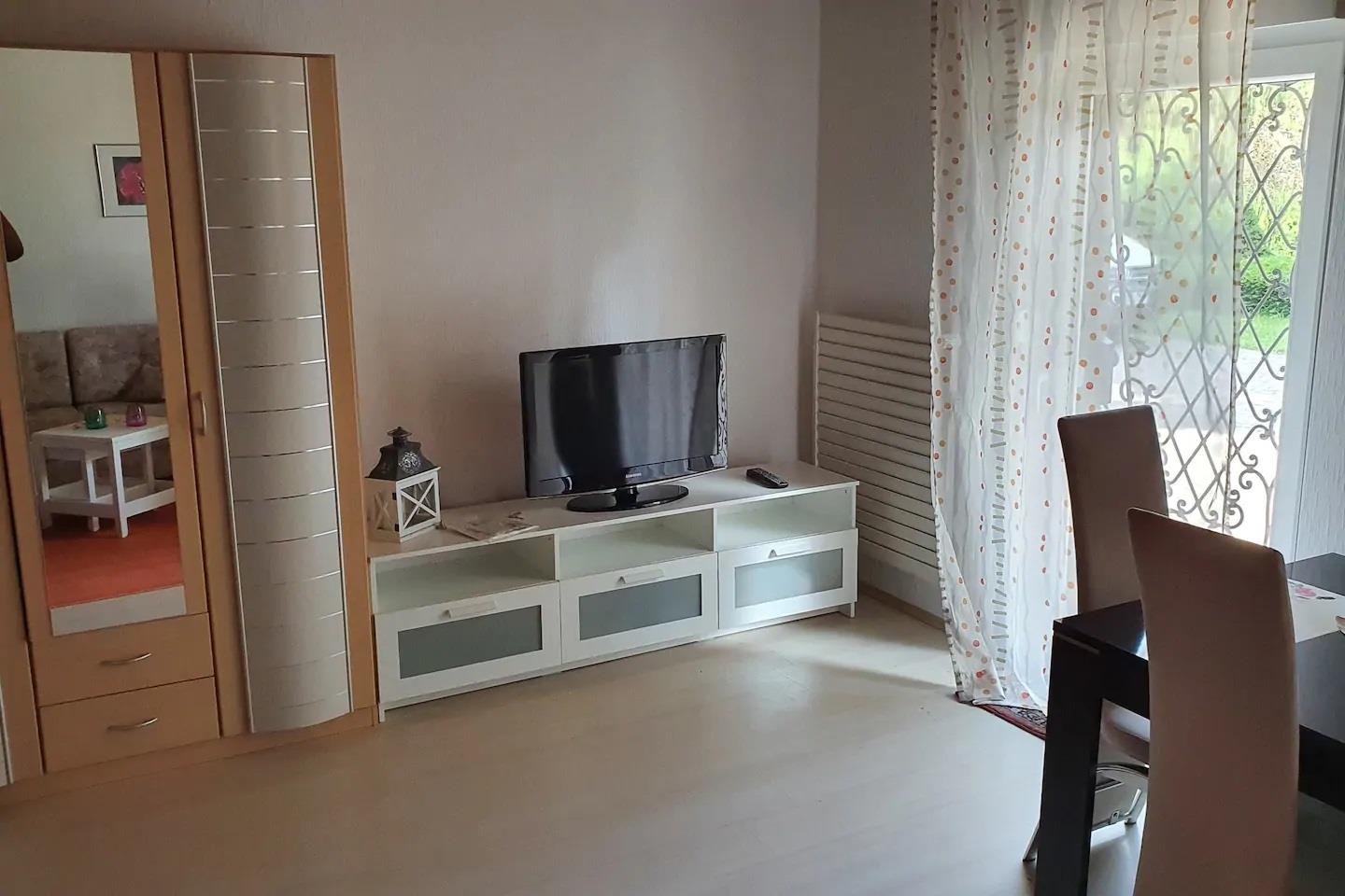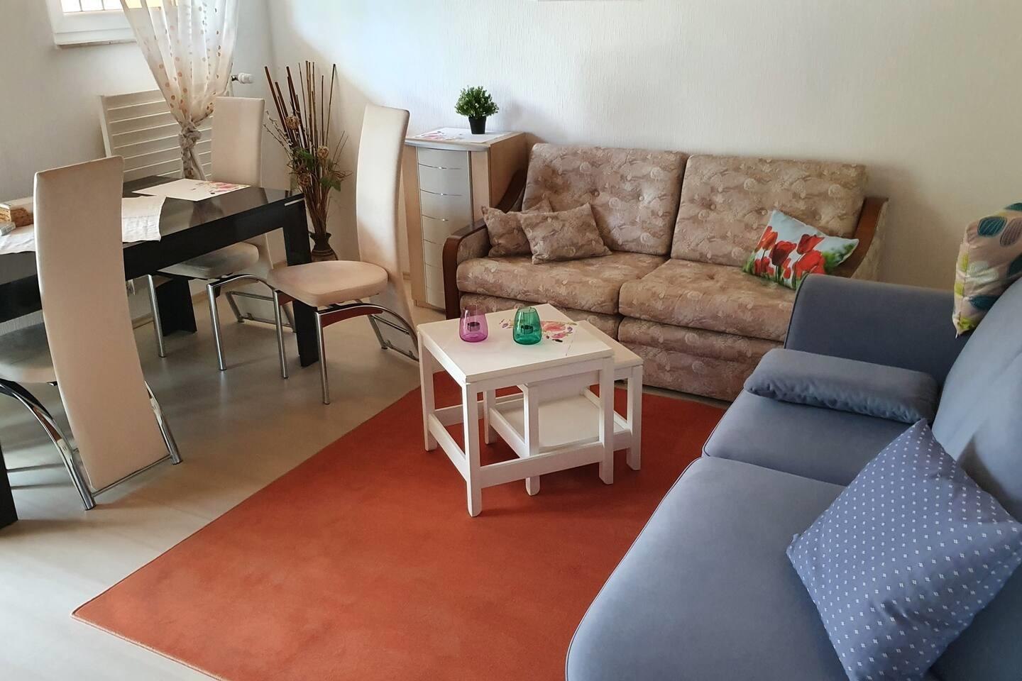 Liebevoll eingerichtet, werden Sie sich bei uns wohlfühlen. In dem Zweifamilienhaus befinden sich 2 junge Familien mit Kindern. Der Garten ist einzigartig. Mit über 700 qm Wiesengrundstück, Trampolin u.v.m. haben auch die Jüngsten ihren Spaß. Bis zu 4 Personen ist die Wohnung vermietbar, wobei die Wohnzimmercouch als Bett (1,50m breit, 1,40m lang) problemlos umgebaut werden kann. Die jungen Familien freuen sich über jeden Gast, Grillabende, nette Gespräche können angeboten werden. Parkplätze befinden sich vor dem Haus. Fahrradabstellplatz in einer Doppelgarage möglich.