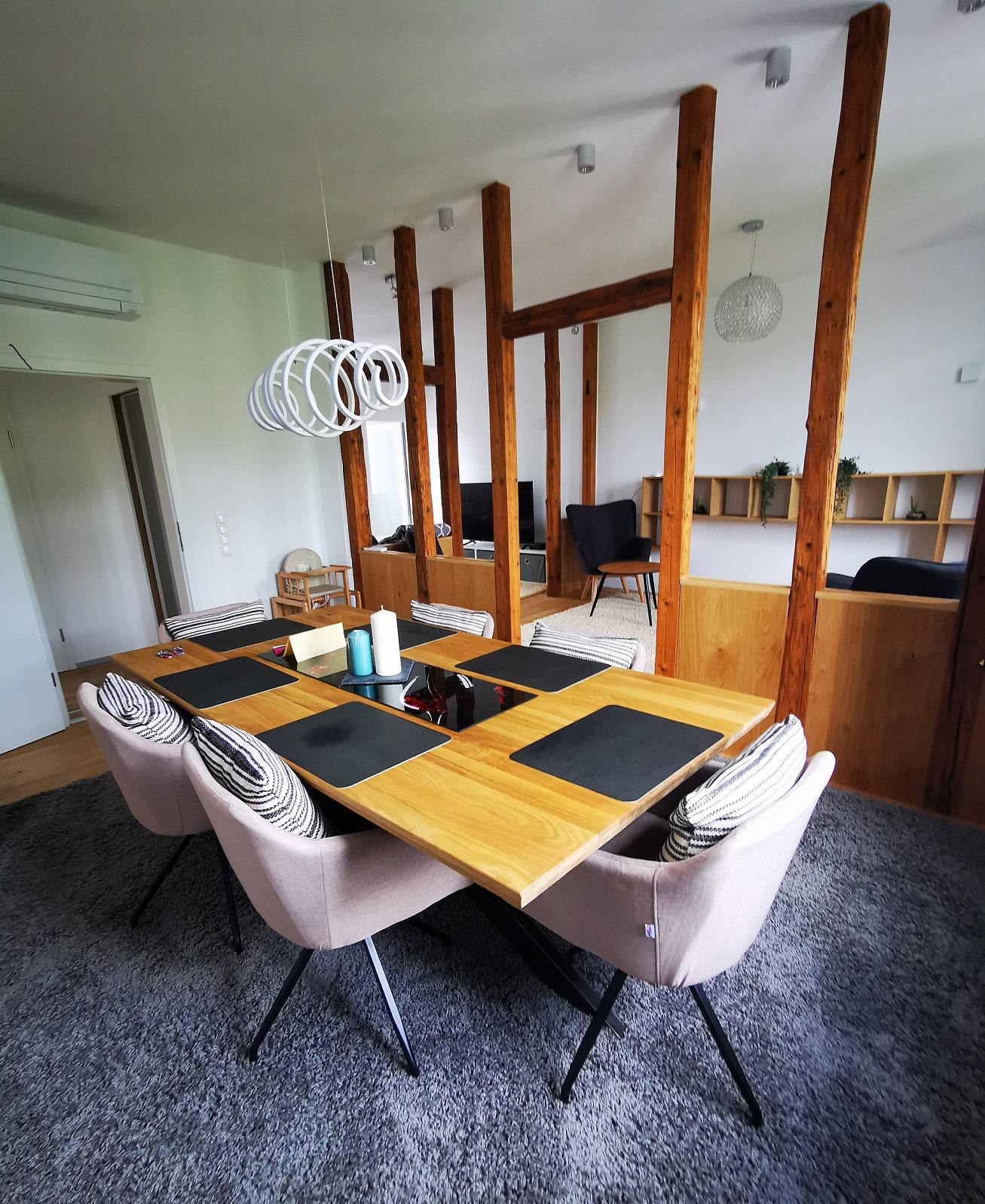 - Wohnraum/Wohnbereich ca. 40 qm mit großen Esstisch für 8 Personen, separate Küche (vom Wohnraum aus zu betreten), WC.