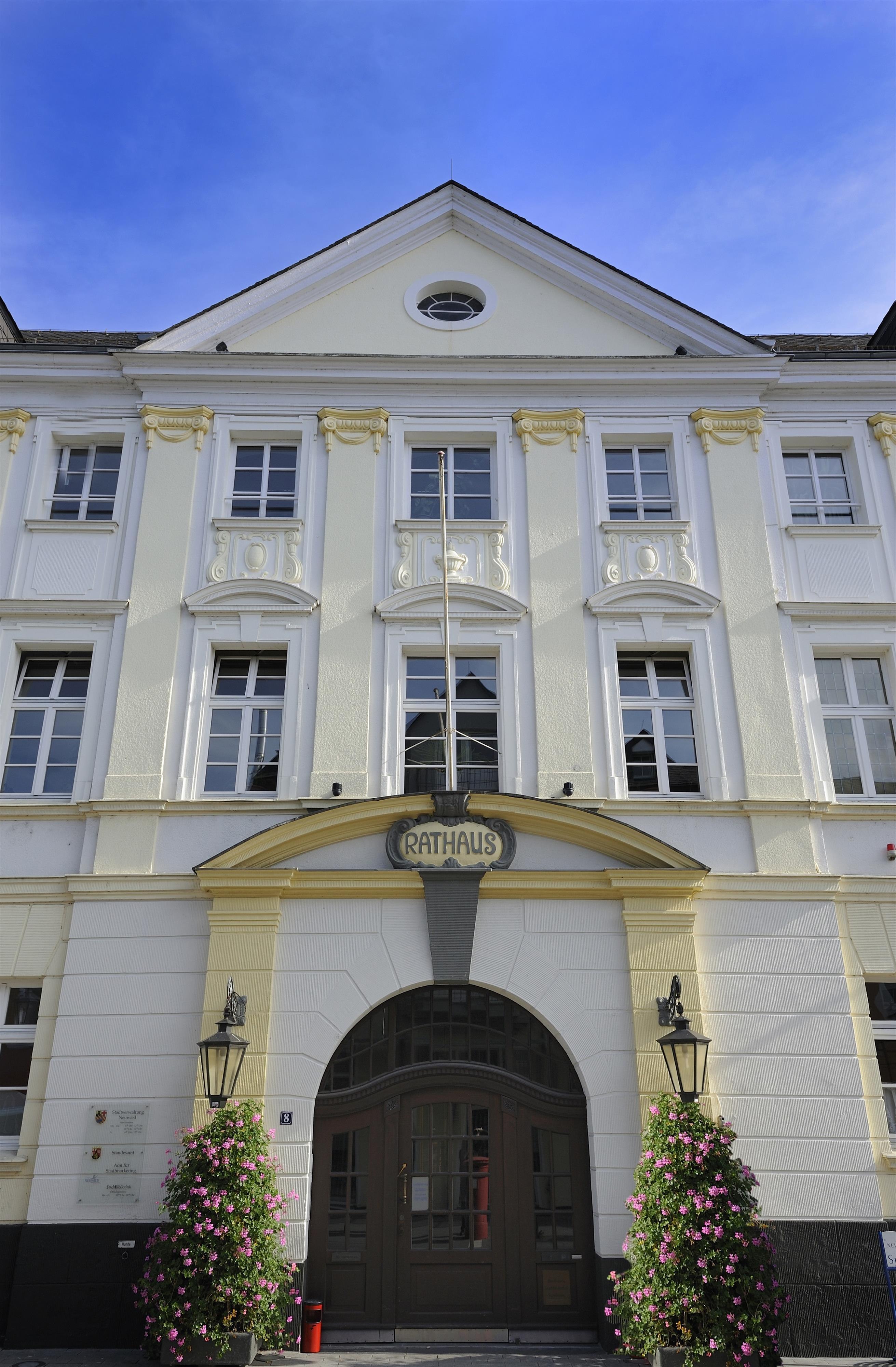 Ein Rathaus als stattliches oder gar prunkvolles Gebäude im Mittelpunkt der Stadt hat es in Neuwied nie gegeben. Die junge Stadt war in den ersten schwierigen Jahrzehnten ihres Bestehens zu arm oder vielleicht auch zu bescheiden, um sich etwas Derartiges zu leisten. Bis zur Bildung des ersten Magistrats 1680/81 besorgte die gräfliche Regierung die Stadtgeschäfte. Zwischen 1699 und 1716 erbaute man auf einem "abgebrannten Platz" Ecke Mittelstraße und Rheinstraße das erste Rathaus, das sich von einfachen Bürgerhäusern nur durch einen besonders hohen Weinkeller, doppelten Treppenaufgang und Doppelfenster unterschied. Dieses Haus ist um 1800 in Privatbesitz gekommen. 1811 erwarb die Stadt ein größeres Eckhaus an der Markt- und Engerser Straße direkt gegenüber der Marktkirche als neues "Stadt-, Schul- und Wachhaus". 1863 wurde das Haus durch einen dreigeschossigen Neubau ersetzt.