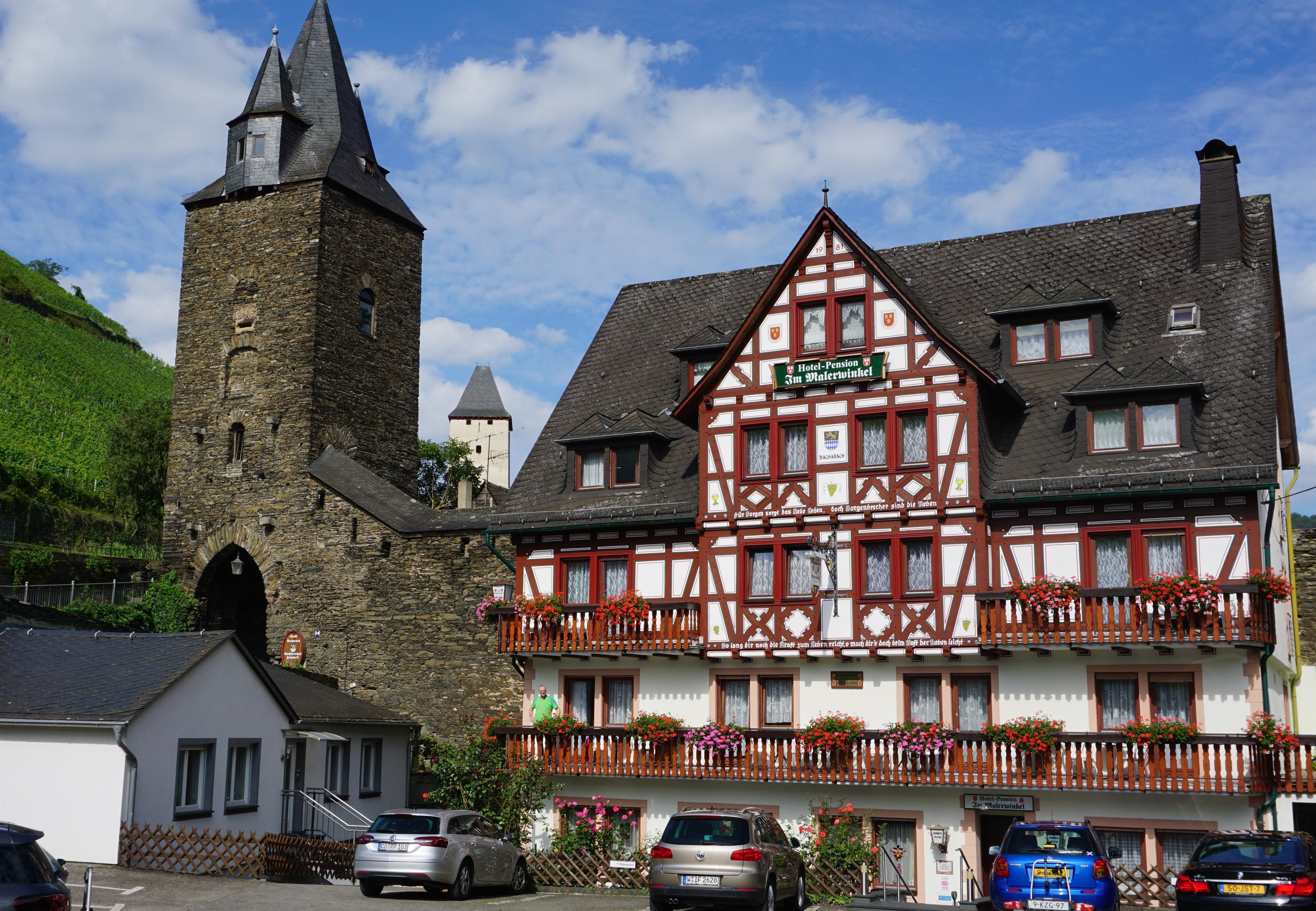 Unser familiengeführtes Haus finden Sie in ruhiger Lage in einem idyllisch, malerisch gelegenen Winkel, direkt am RheinBurgenWeg der Rhein-/Weinstadt Bacharach. Genießen Sie Ihren Urlaub zwischen Wehrtürmen und der historischen Stadtmauer unterhalb der Burg Stahleck, mit traumhaftem Blick auf die Weinberge und Gärten. Unsere Zimmer, Appartements und Ferienwohnung sind modern eingerichtet. Zum Entspannen lädt eine große Gartenterrasse mit Liegewiese ein. Großer hauseigener Parkplatz. Zentral gelegen in 2 Gehminuten sind Sie am Marktplatz, in 5 Gehminuten in den Rheinanlagen mit Schiffsanlegestellen. Empfehlenswerte Weinstuben und Speisegaststätten liegen in der Nähe.