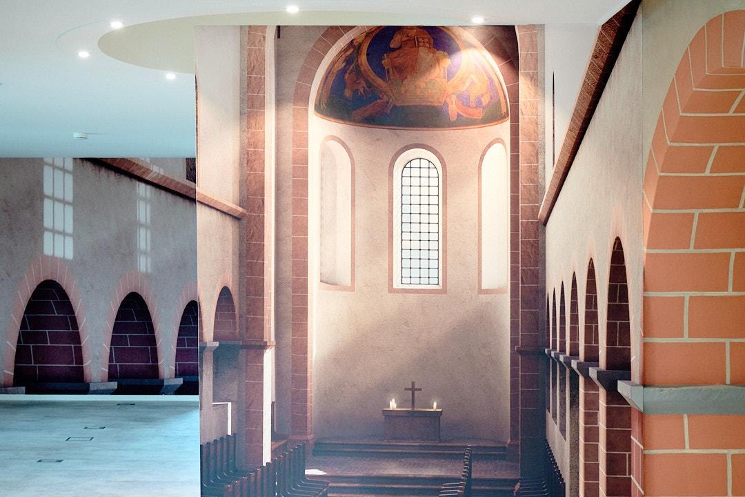 Der „Fahrstuhl in die Vergangenheit“ fährt mitten hinein in das Kloster, wie es im 12. oder 13. Jahrhundert ausgesehen haben mag. Zuerst geht es abwärts auf das Laufniveau der Kirche in der Hildegard-Zeit. Dann entscheiden Sie, wie es weitergeht: Zuerst ein Rundgang durch die Kirche, in den Kreuzgang hinein und dann raus auf den Klosterhof? Oder doch lieber gleich hinauf auf den Kirchturm, um den Ausblick auf das hochmittelalterliche Bingen zu genießen?