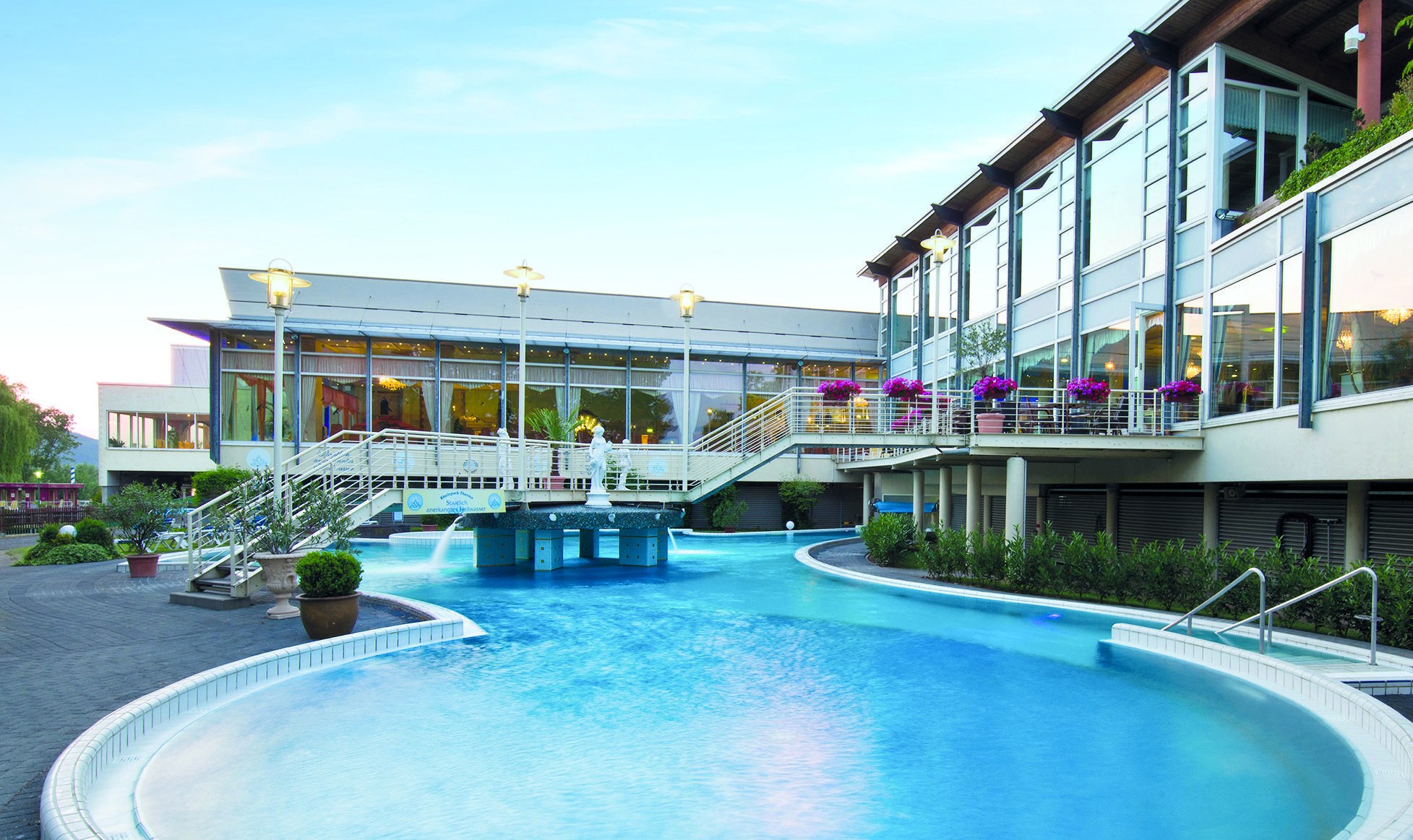 Die Kristall Rheinpark-Therme in Bad Hönningen liegt umgeben von wunderschöner Natur unmittelbar am Rhein. Sie ist eine regelrechte Oase, die Sie mit ihrer abwechslungsreichen Themenwelt erwartet. Echter Marmor und mehrere Tonnen Edel- und Halbedelsteine, arrangiert nach der Heilslehre der Weltheiligen Hildegard von Bingen, sorgen für echtes venezianisches Ambiente. Erleben Sie Genuss pur. Tanken Sie einmal richtig auf und baden Sie sich gesund in bestem Thermal-Heilwasser aus eigener Quelle. Es wird aus einer Tiefe von 370 Metern gefördert und enthält wertvolles Natrium-Magnesium-Hydrocarbonat-Chlorid. Dieses hervorragende und mineralstoffreiche Heilwasser befüllt das Therapiebecken sowie die beiden Panoramabecken innen und außen, während Sie sich darin von den Massagedüsen, Wand- und Bodensprudlern verwöhnen lassen, genießen Sie einen traumhaften Blick auf den Rhein. Ein weiteres Highlight ist das berühmte „Granderwasser“. Entspannung finden Sie auch in der Saunalandschaft, die dem Marktplatz von Venedig nachempfunden ist. Sieben große Saunen laden hier zum Schwitzen, Entschlacken und Regenieren ein. Betörend duftende Aufgüsse, Dampf- und Aromabäder und ein osmanischer Hamam runden das vielfältige Angebot ab. Die Thermen- und Saunagastronomie lockt mit ihren ausgezeichneten Speisen und einer herrlichen Sonnenterrasse. Nehmen Sie Platz und genießen Sie von hier aus den wundervollen Blick auf den Rhein.