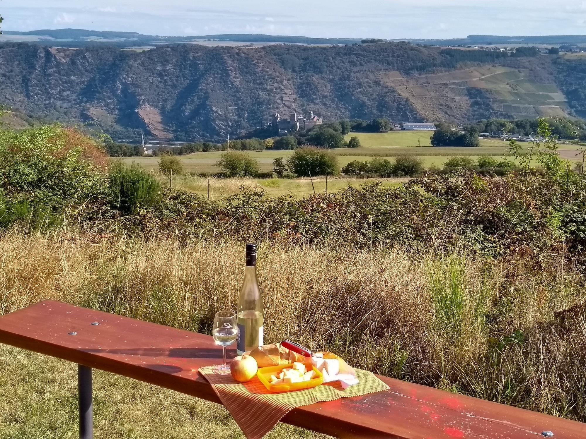Picknickbank mit Schönburgblick am Wanderweg "Rund um Dellwe"