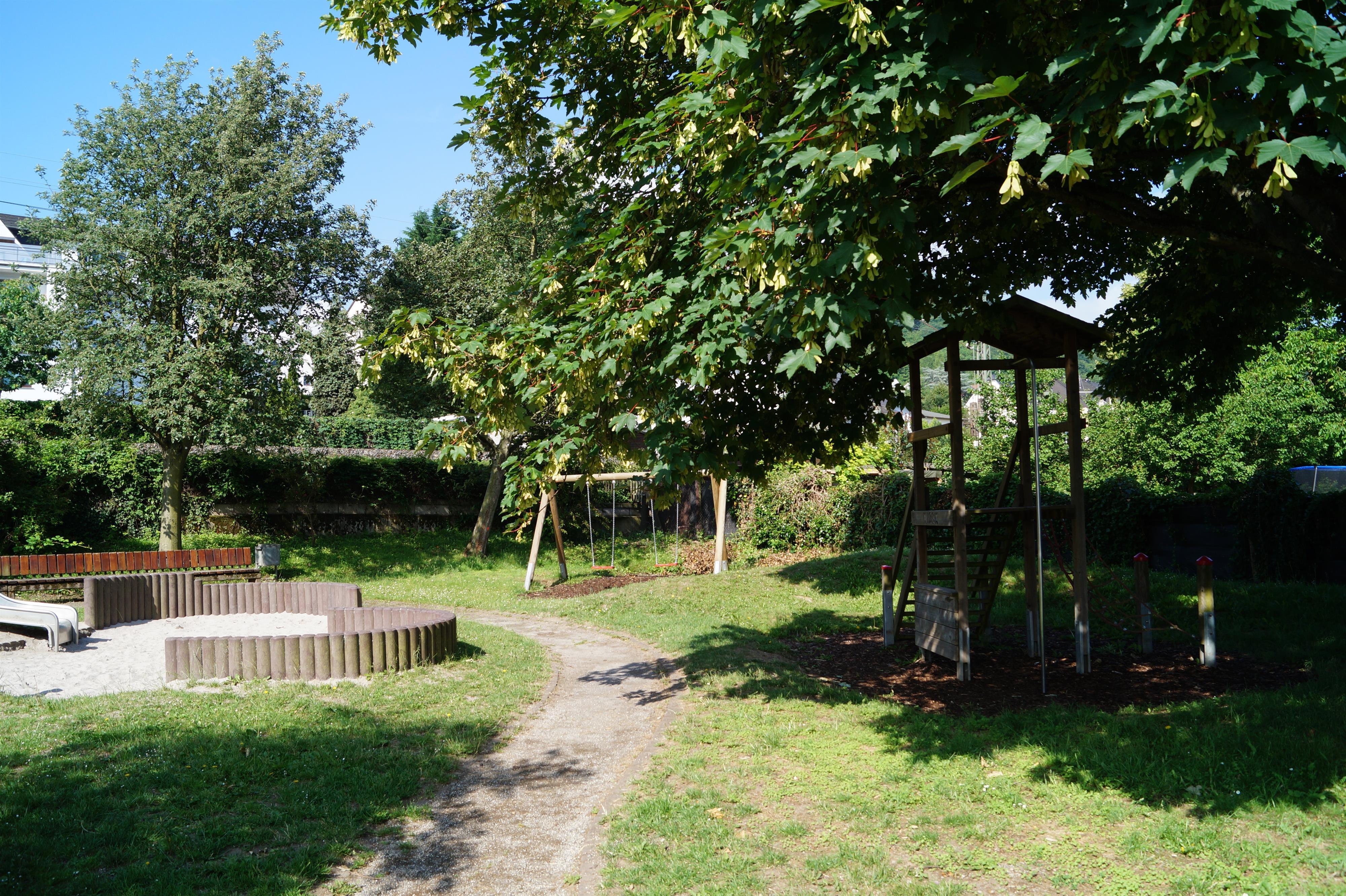 Der öffentliche Spielplatz liegt direkt am Rhein und bietet vielfältige Spiel- und Bewegungsmöglichkeiten für Kinder. Zur Ausstattung gehören eine Rutsche, ein Sandkasten, eine Schaukel sowie ein Spielturm beziehungsweise Spielhaus mit Kletterseilen und einer Rutschstange. Sitzgelegenheiten zum Ausruhen sind ebenfalls vorhanden.