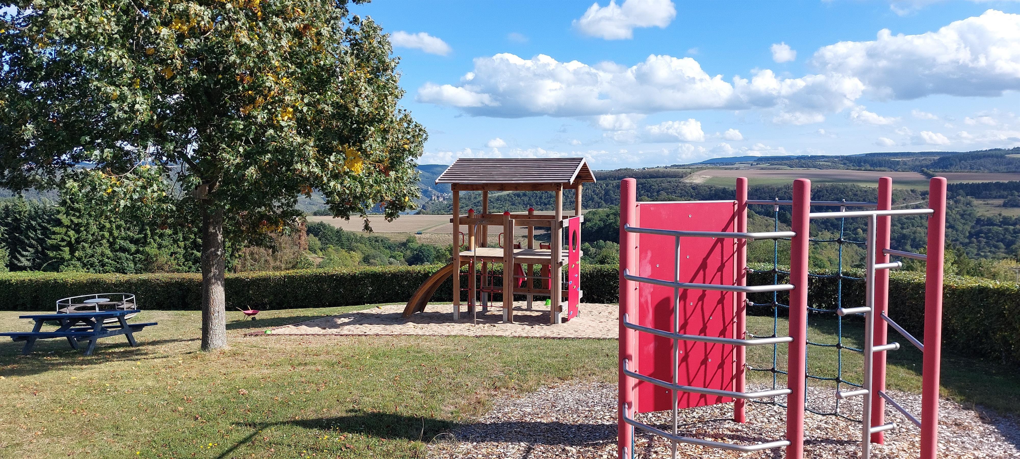 Schöner, gepflegter Kinderspielplatz am Ortsrand von Niederburg mit wunderschöner Aussicht auf das Rheintal mit vielen Spielmöglichkeiten.