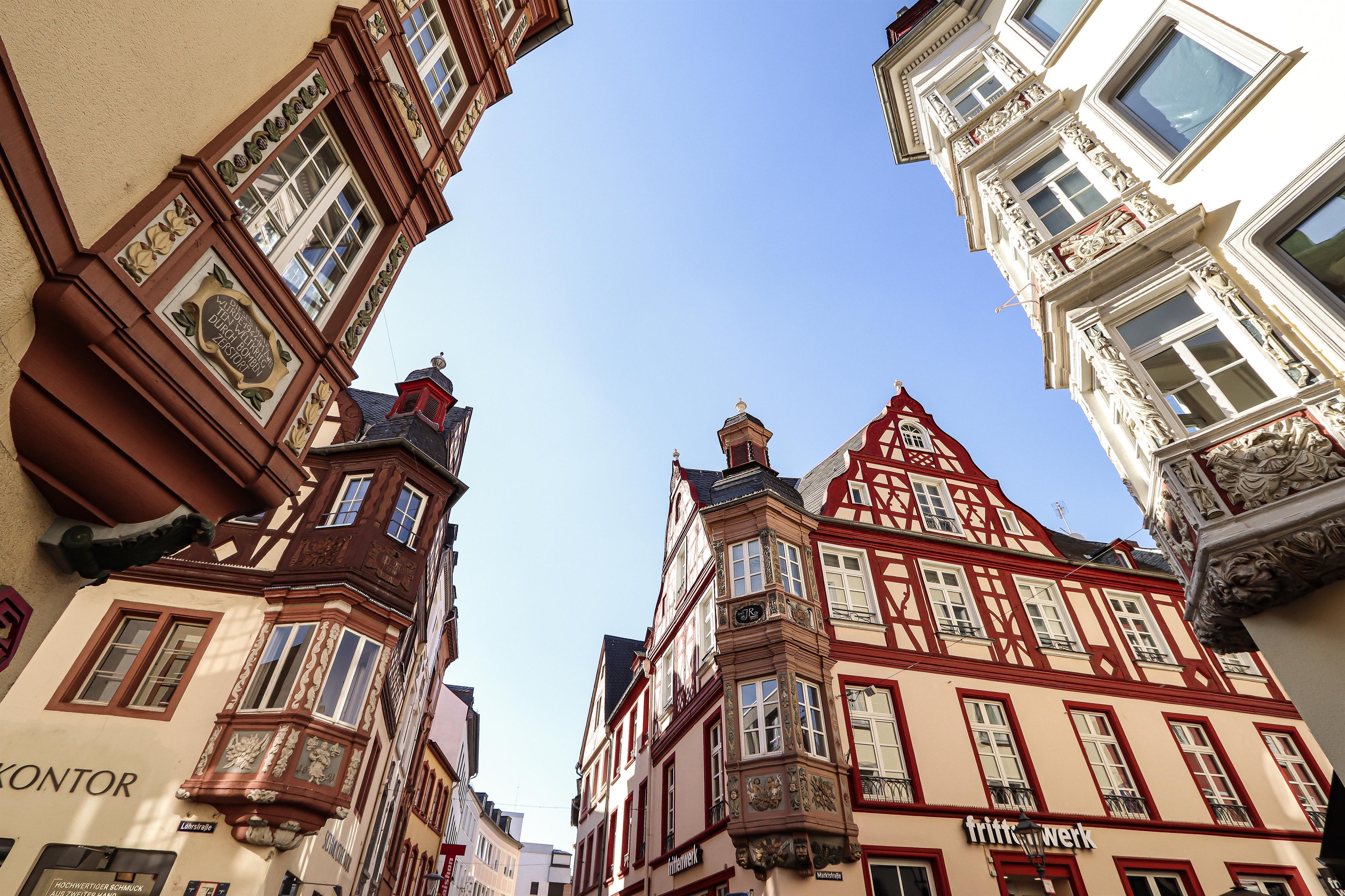 Die vier Häuser mit den kunstvollen Erkertürmen wurden 1608 erbaut und nach Zerstörung 1688 Ludwig den XIV. im Pfälzischen Erbfolgekrieg zwischen 1689 und 1692 wiederhergestellt und die Erker erneuert. In die Ecke des Hauses „Zum grünen Baum“ wurde 1950 ein Durchgang eingebaut. Er bot den Fußgängern eine Ausweichmöglichkeit, wenn hier die 1899-1967 bestehende Straßenbahn um die Ecke bog. Das Haus „Zum heiligen Petrus“ beherbergte von 1730 bis in die 2000er Jahre eine Apotheke. Das Haus mit den Pflanzen und Putten auf dem Erker überstand als einziges die Bombenangriffe des Zweiten Weltkrieges nahezu unbeschadet. Am vierten Gebäude, der „Hauptwache“, erinnern Geschütze, Fahnen, Musketen und Hörner an die kurtrierischen Soldaten, die von hier aus polizeiliche Aufgaben wahrnahmen. In dem Gebäude befand sich noch bis 1848 die Hauptwache der preußischen Polizei.