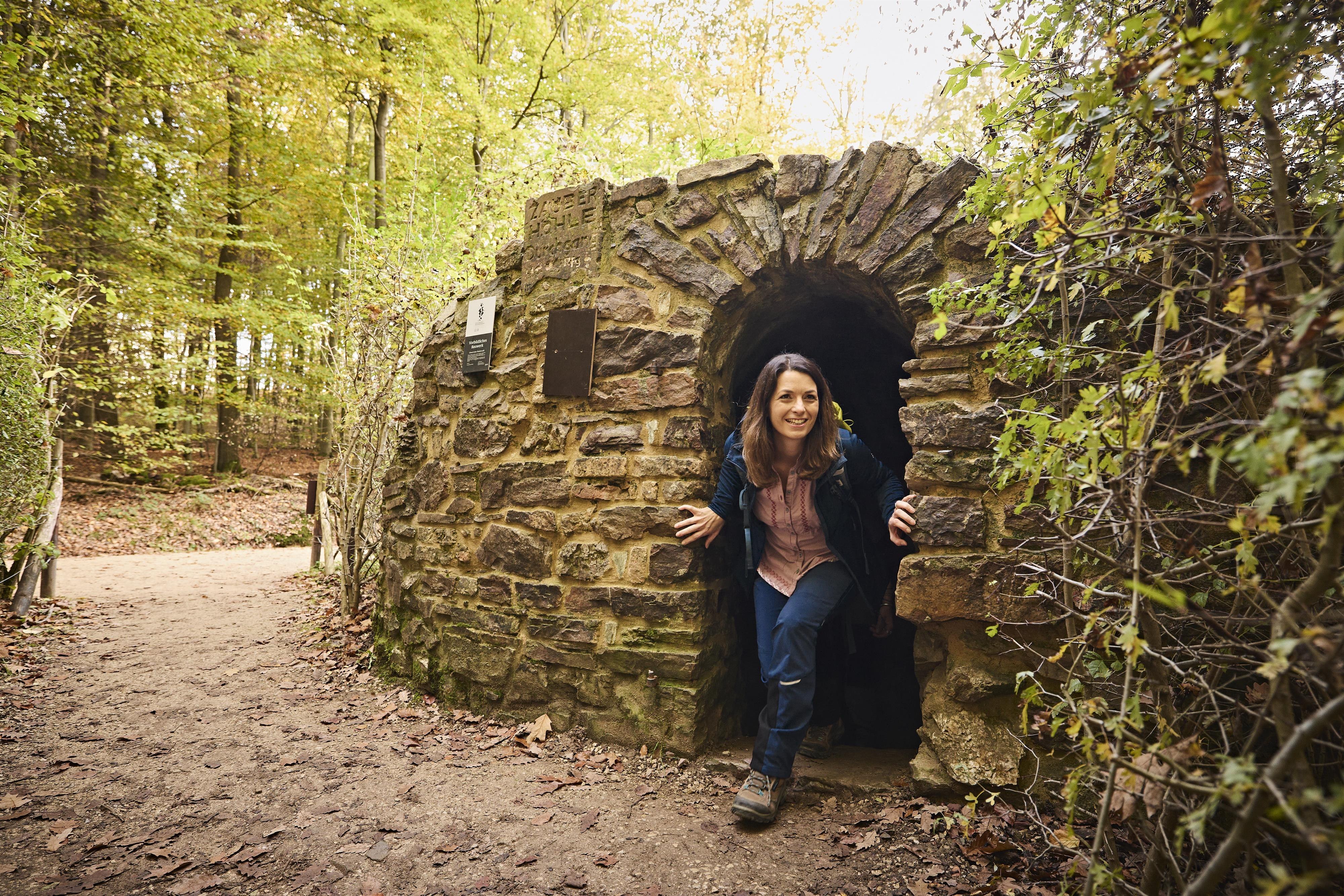 Die Zauberhöhle wurde um 1790 erbaut und ist ein ummauerter Gang von etwa 60 m Länge, dessen Wände ursprünglich mit glitzernden Glassteinen verziert waren. Der unbeleuchtete Gang mündet in einer Rotunde, der „Zauberhütte“. Trat man nach dem Verwirrspiel des halbdunklen Gangs in die Zauberhütte, so öffnete sich dem Besucher die Sichtschneise zum Rhein hin – wie in einer Zauberwelt der Natur.