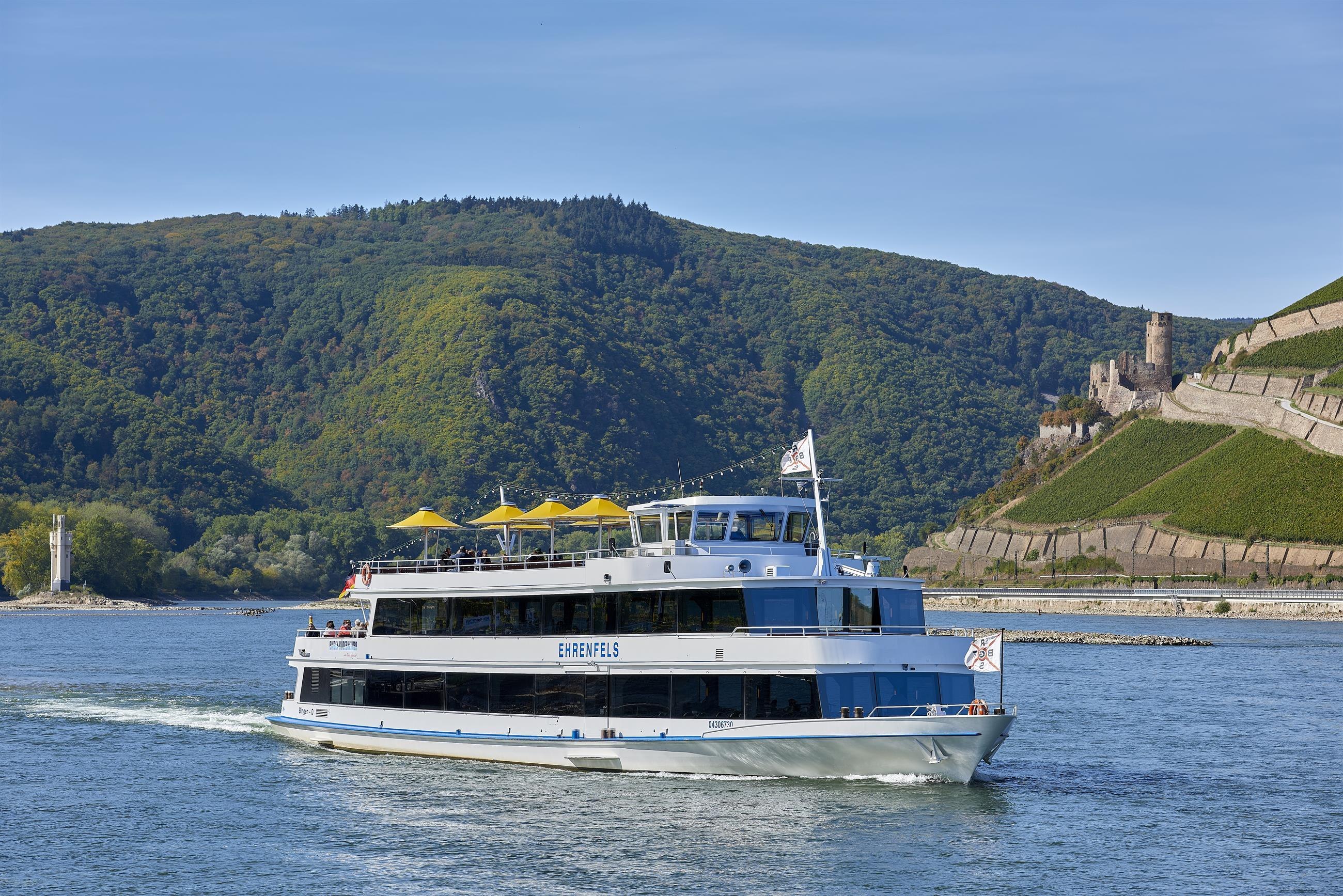 The Bingen-Rüdesheimer passenger shipping navigates the Upper Middle Rhine Valley (the Middle Rhine Valley was declared a UNESCO World Heritage Site in 2002!) with five scheduled service boats and stops at numerous locations between Bingen and St. Goar, Rüdesheim and St. Goarshausen. The offerings range from castle trips (1.5 hours) to Kölsch parties, After Work trips, romantic Loreley cruises (3-hour round trip) to murder mystery dinners. Charter trips available year-round