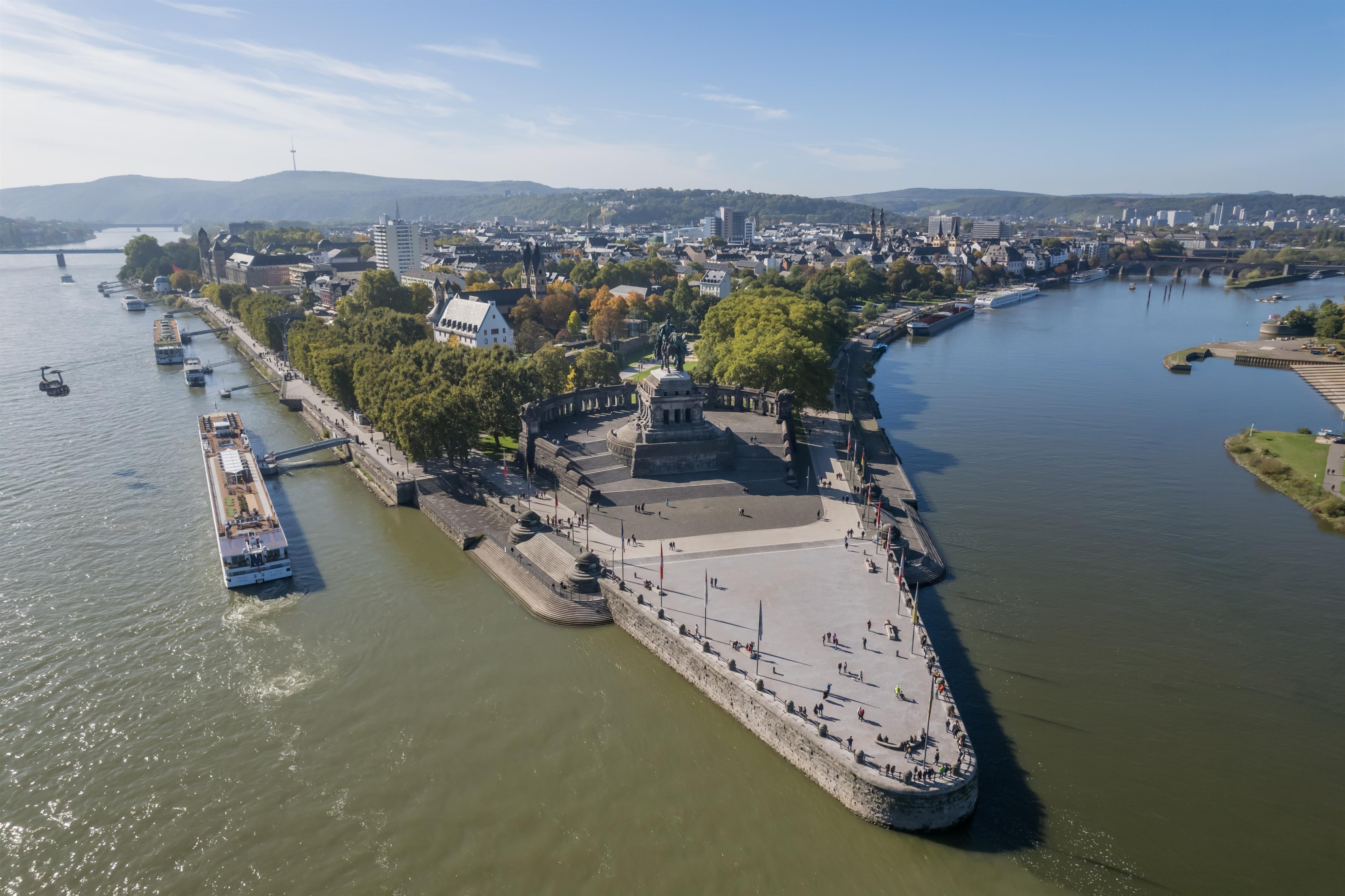 The establishment of the Teutonic Order at the confluence of the Rhine and Moselle in 1216 gave this historic site its name, the “Deutsches Eck” (“German Corner”). Koblenz also owes its name to the meeting point of the Rhine and the Moselle - from “Castellum apud Confluentes”, Latin for “fort at the confluence”, which over time became the current name of Koblenz.