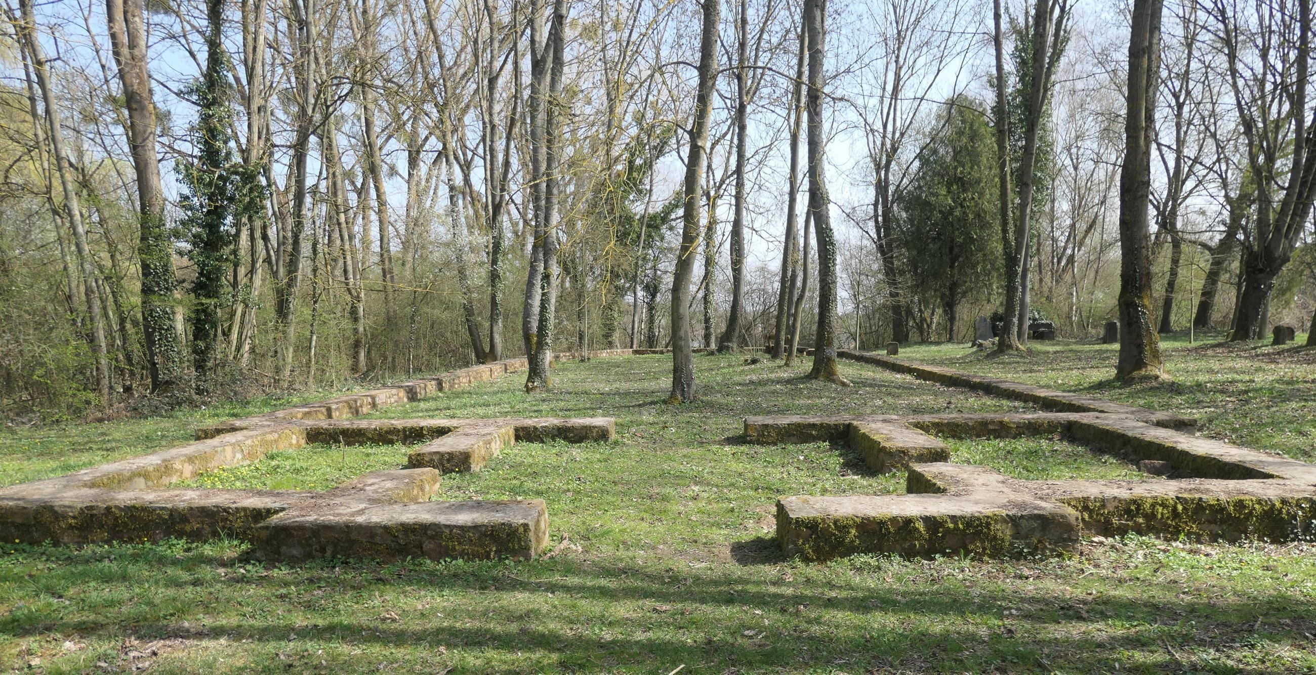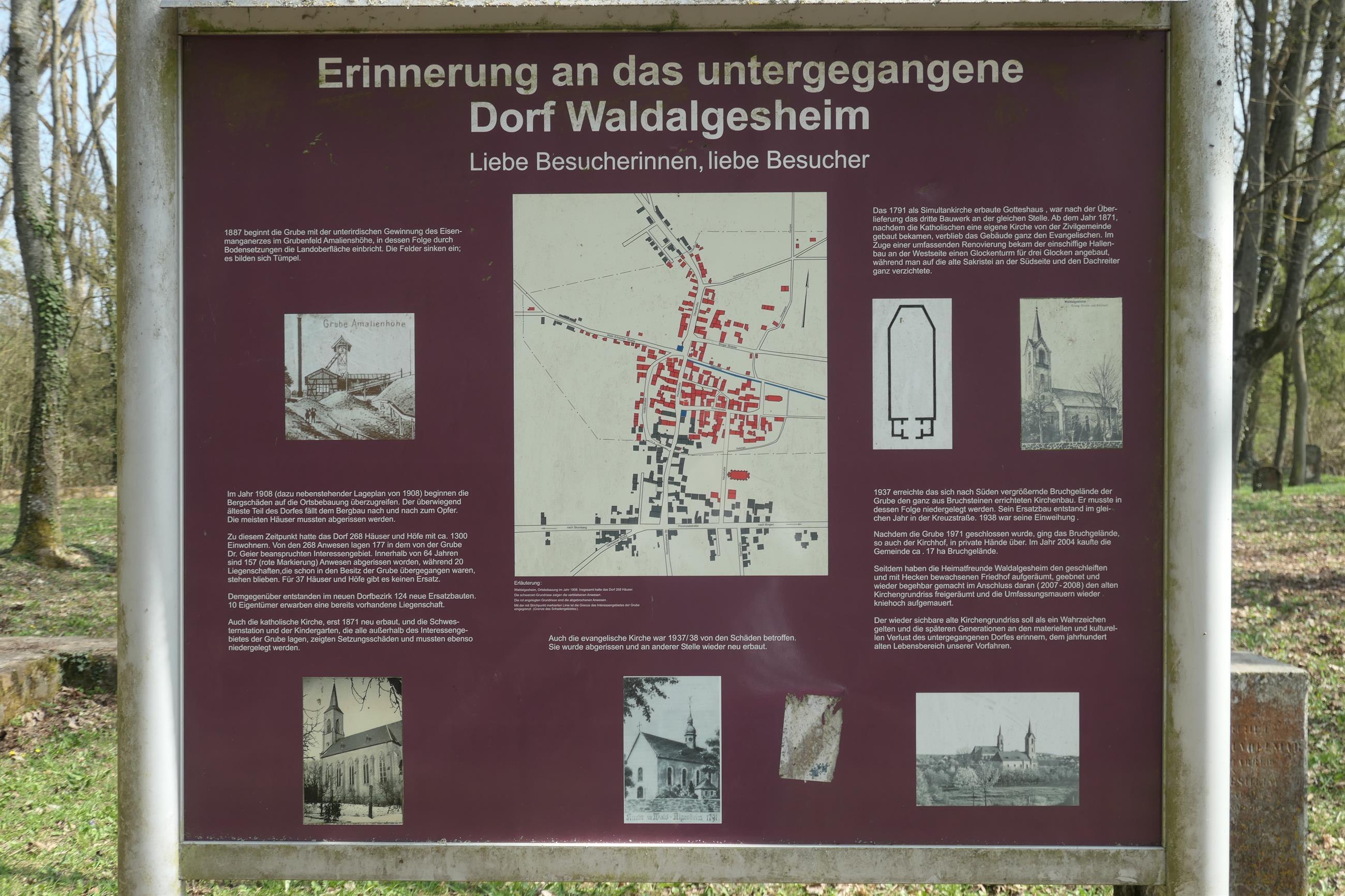 The church ground plan, which is visible again, is a reminder of the history of damage caused by mining subsidence and today serves as a landmark of the "submerged" village. The green area is located on the new road north of the Celtic Hall. As a result of the extraction of iron manganese ore in the Amalienhöhe mine field to the north, subsidence began to affect the village of Waldalgesheim from 1908. The houses of the predominantly oldest part of the village had to be demolished. Of the 268 houses and farms existing in 1908, 177 were located in the mining area recognized as a damage area. By the 1970s, 157 properties had been demolished. There were no replacements for 37 houses and farms. In the new village district, 124 new replacements were built. The Catholic and Protestant churches in the damage area and the "quarry site" respectively also had to be demolished.