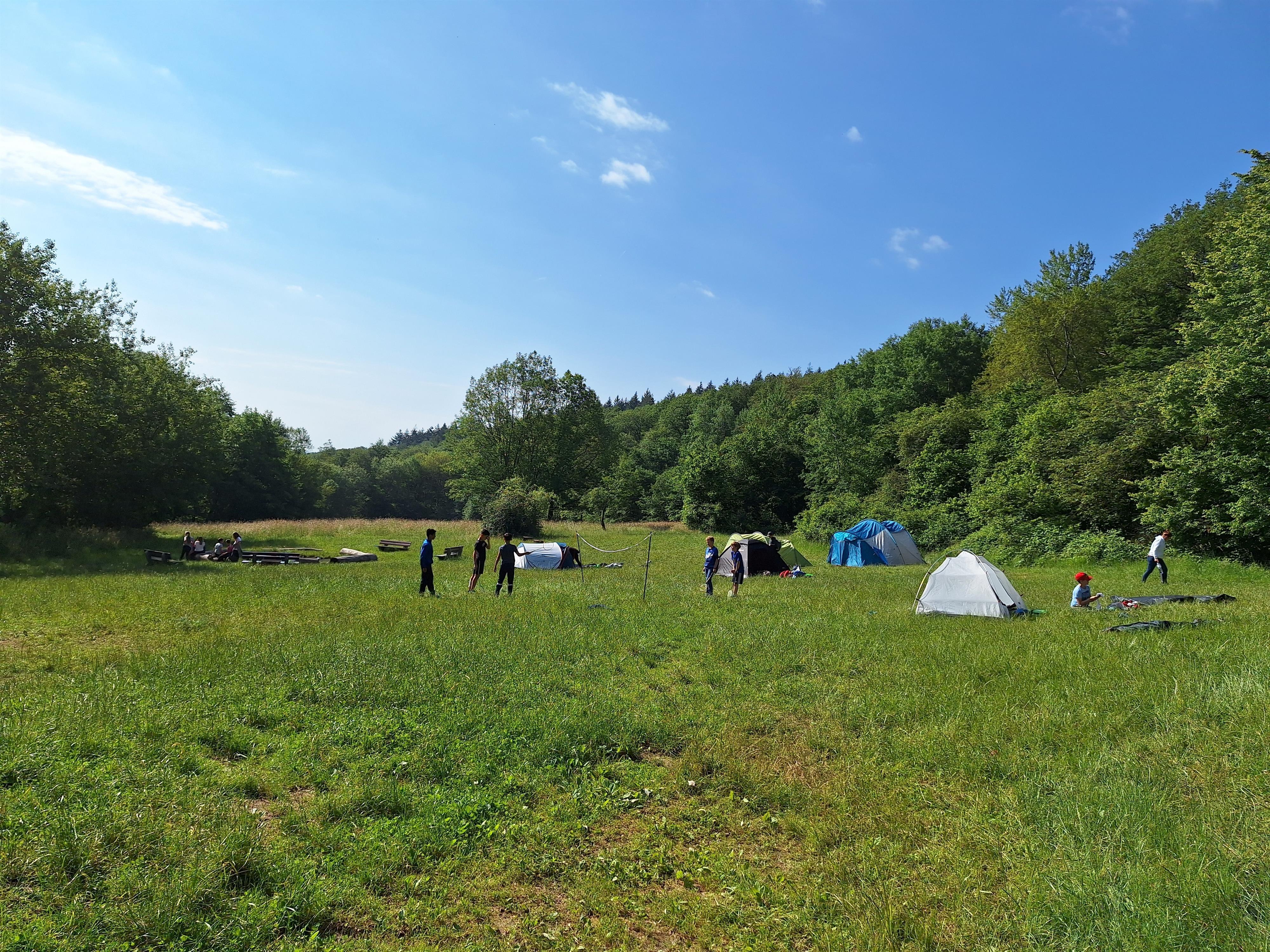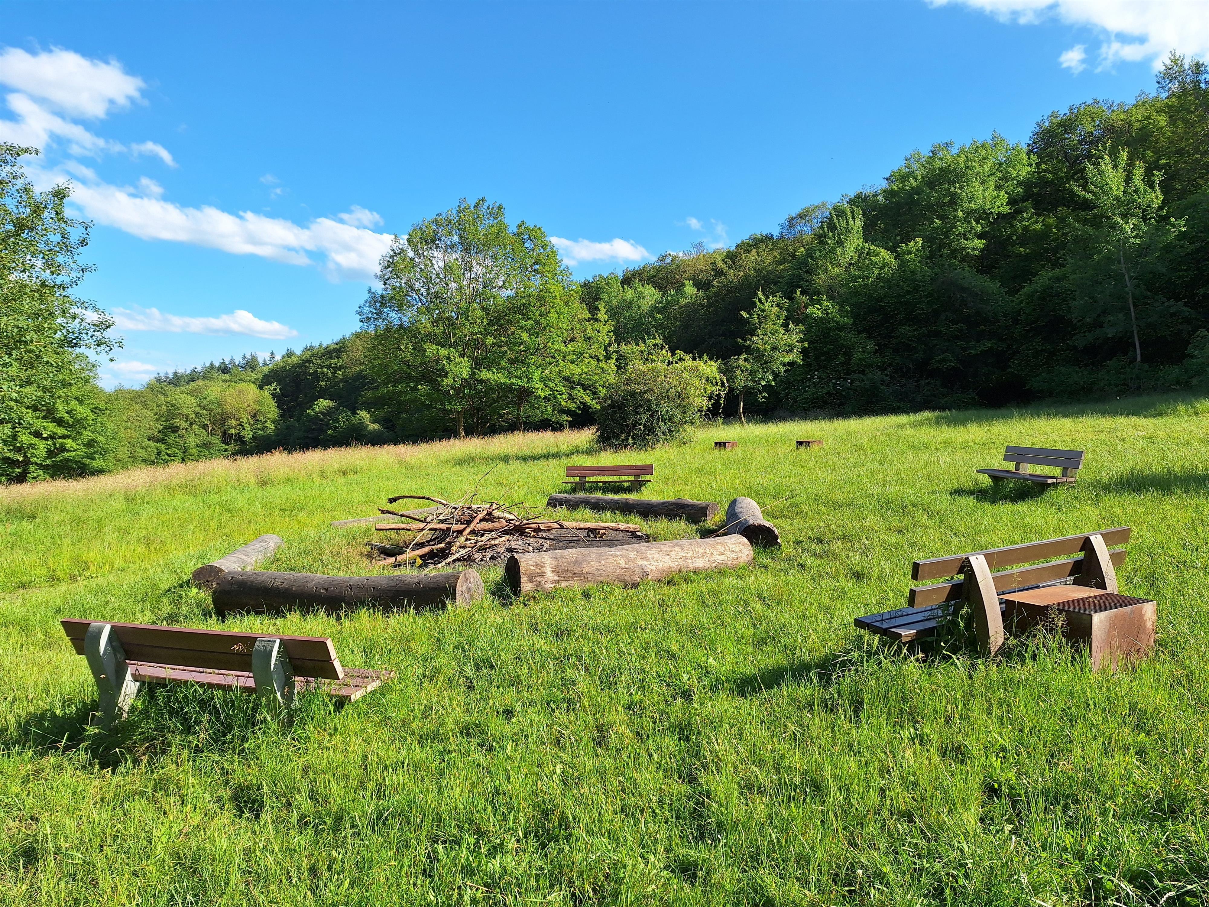 It is located on a gently sloping clearing, which is completely surrounded by forest and is about 4 km from the Rhine. On an area of 5500 square meters, the campground is suitable for groups of up to 60 people (children up to 18 years and guardians). There are two lockable toilets on the site and a large open fireplace with seating all around.