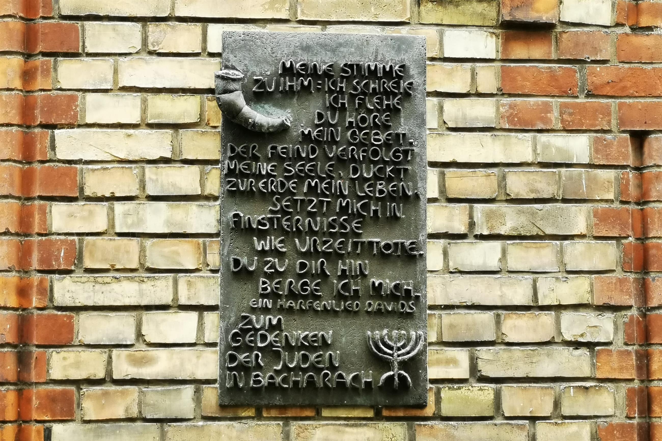 Already in the first half of the 12th century Jews lived in the city. Persecutions and pogroms have been taking place since the 13th century. As a result of the alleged ritual murder of the boy Werner in 1283, 26 Jews were murdered in the city. Other Jews had fled the city and returned only later. Around 1316, Jewish inhabitants in the town can again be traced. During the persecution of the Jews in the summer of 1337 and during the plague in 1348/49, Jewish life in the town was once again wiped out. Until the persecution of the Jews from the Electoral Palatinate in 1390, several Jews who had moved in from other cities are mentioned in the city. A Jewish community was founded in Bacharach in the 1860s. At that time the Jewish people living in Niederheimbach and Oberheimbach also belonged to the community. Of the Jewish people born in Bacharach and/or living in the village for a longer period of time, 17 people died during the Nazi era, eight people in Niederheimbach. To commemorate the murdered Jews, "Stolpersteine" were laid at Langstraße 43 and 25, Bauerstraße 5 and Oberstraße 3. A further commemorative plaque is located in Untergasse 26. The Israelite fraternity community of Bacharach operated, among other things, the Jewish cemetery in Kaub, which was used until the middle of the 19th century. Jewish cemeteries were then established in Oberheimbach and Bacharach.
