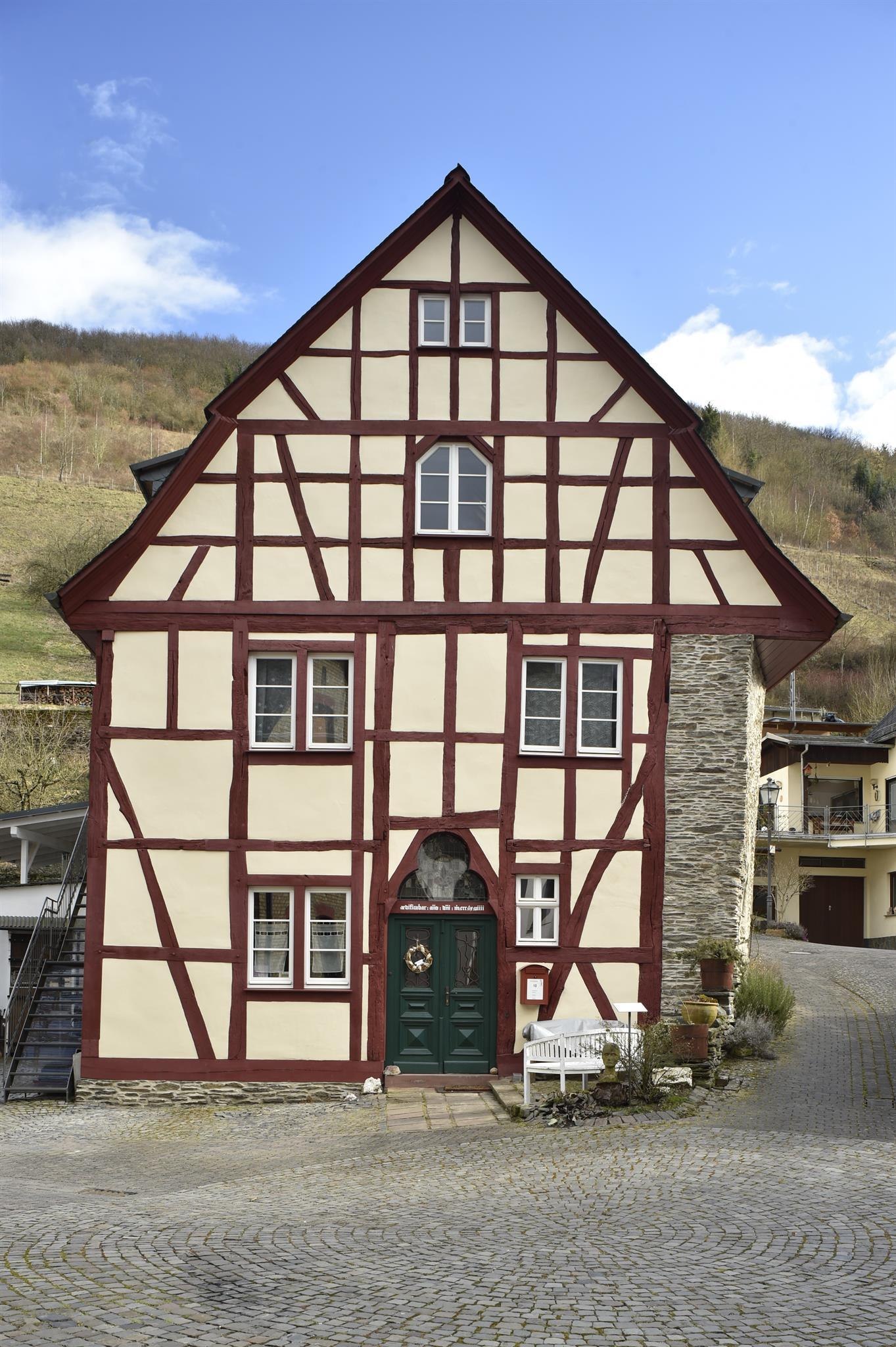 In its core a late Gothic residential building in post-and-beam construction (1368/69 d) with hall, barrel-vaulted cellar and well shaft on the first floor. The quarry stone wall on the eaves is probably older, possibly from a previous building. Half-timbered gable end with "tracery portal". Complete roof structure and half-timbering of the gable triangle heavily modified around 1800. Half-timbering on the upper floor of the eastern eaves side with six windows (window band), each equipped with fanlights and formerly vertical sliding shutters. The design of the windows and portal underlines the representative, possibly stately significance of the building. One of the oldest buildings on the Middle Rhine and of extraordinary importance for house research.