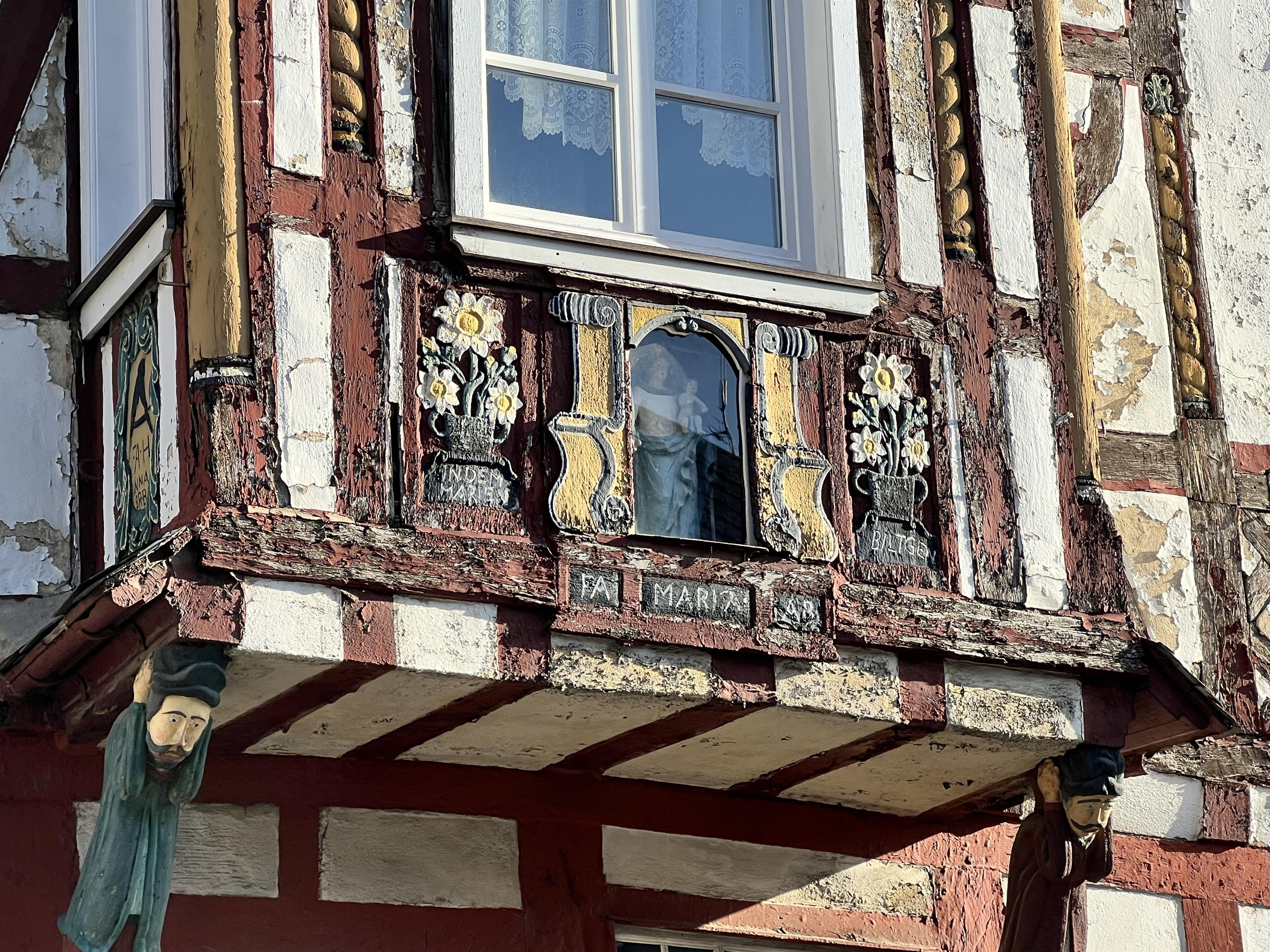 From 1651 to 1685, the church house of the Protestant Reformed congregation of Rhens was located on this very spot. This was a parish hall equipped with benches and a pulpit. After the Electorate of Cologne had decreed the conversion or emigration of the last Protestants of Rhens in 1679, contrary to the provisions of the Peace of Westphalia of 1648, the Protestant tradition of the town of Rhens, which had existed for over 150 years, came to a complete standstill in 1685. In order to remove any outward sign of a confessional division of the town, the pews and pulpit were removed. The building was rented to a blacksmith, but despite all the efforts of the then pastor Daniels, it could not be taken for the Catholic church, because it belonged to the landgraves of Hesse. In 1698 the building burned down - allegedly because the blacksmith had handled the fire somewhat carelessly. Nevertheless, rumors persisted that the schoolmaster had started the fire intentionally. Evidence for this assumption could not or would not be produced. The property with the collapsed cellar of the Lutheran church house remained undeveloped until around 1730 when the Hessian authorities became aware by chance that they still owned a plot of land in Rhens. They sold the building plot to Philipp Altenhofen and donated the proceeds to the new building of the Protestant Reformed congregation in Bad Schwalbach, which the last Protestant pastor of Rhens, Johann Bernhard Delph, had founded in 1685. One may speculate about the history of the little picture of the Virgin Mary, which is located between the initials of the builders in a niche at the bay window. Perhaps it belonged to a wayside shrine that was already in this location before the construction of this house. In that case, like the shrine below Dionysius Church, it would have expressed the triumph of the Catholic Church over Protestantism - all the more so because the Protestants' aversion to the Catholic cult of the Virgin Mary was a popular theme of the 17th century confessional controversy.