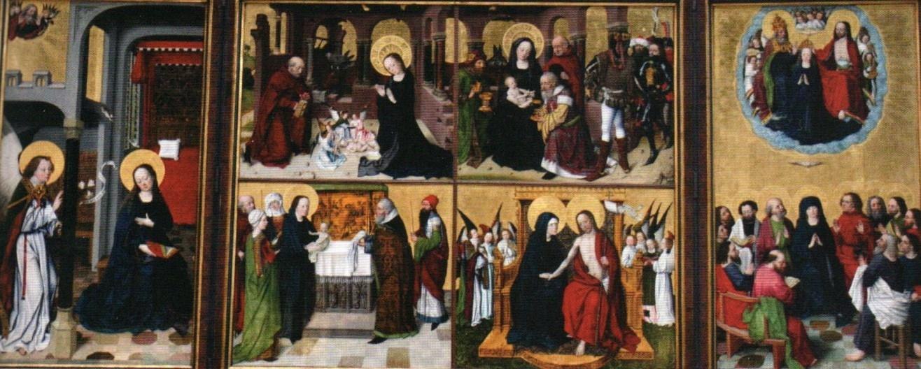 When open, the altar shows a scene of the Annunciation on the left inner wing. On the middle panel, the birth of Christ and the adoration of the Magi are shown above and the offering in the temple as well as Mary and Christ after the resurrection are shown below. The right inner wing shows the outpouring of the Holy Spirit at Pentecost and above it a trinitarian coronation of Mary. A second Annunciation appears on the left of the outer wings and the Crucifixion with Mary and John on the right. The painter of the Marien Altar is the so-called Master of the Lyversberg Passion, who appeared in Cologne around 1460. The altar is one of the first great works by this artist and is rooted in the long Cologne painting tradition.