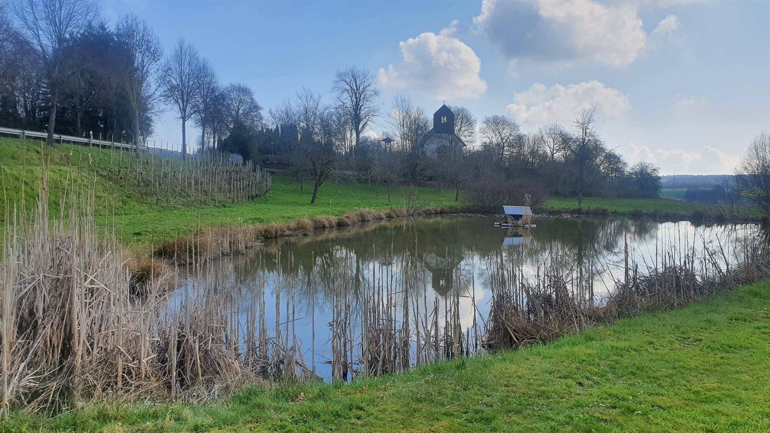 In the immediate vicinity of the nature loop "Oberes Simmerbachtal" there is a small, idyllically situated pond with a bench for resting.