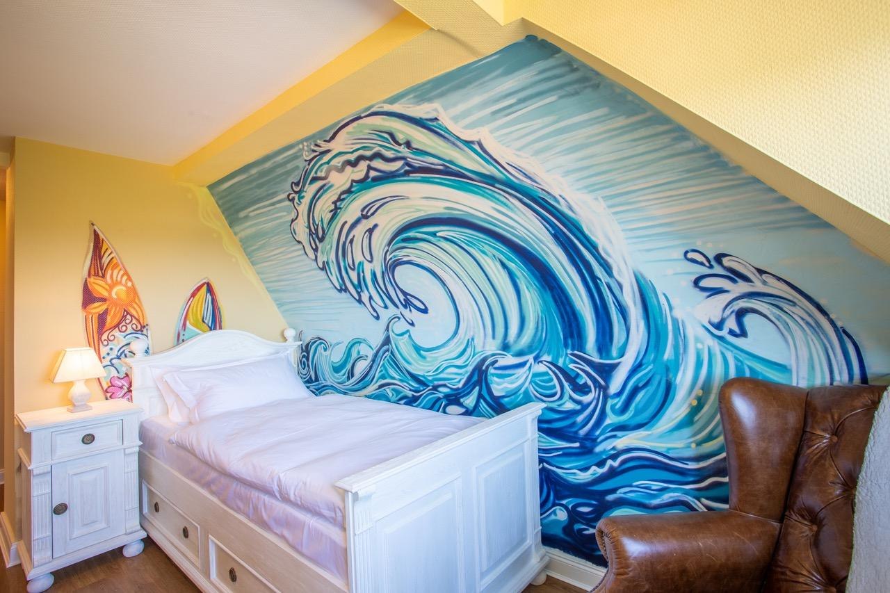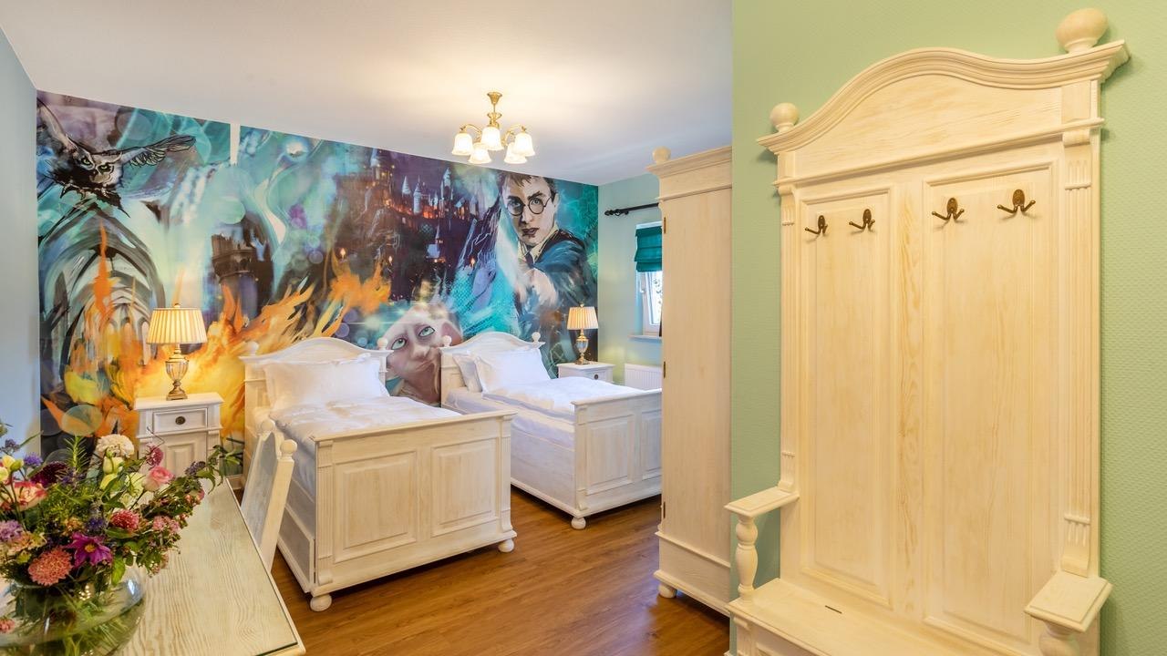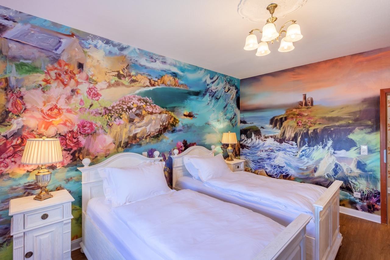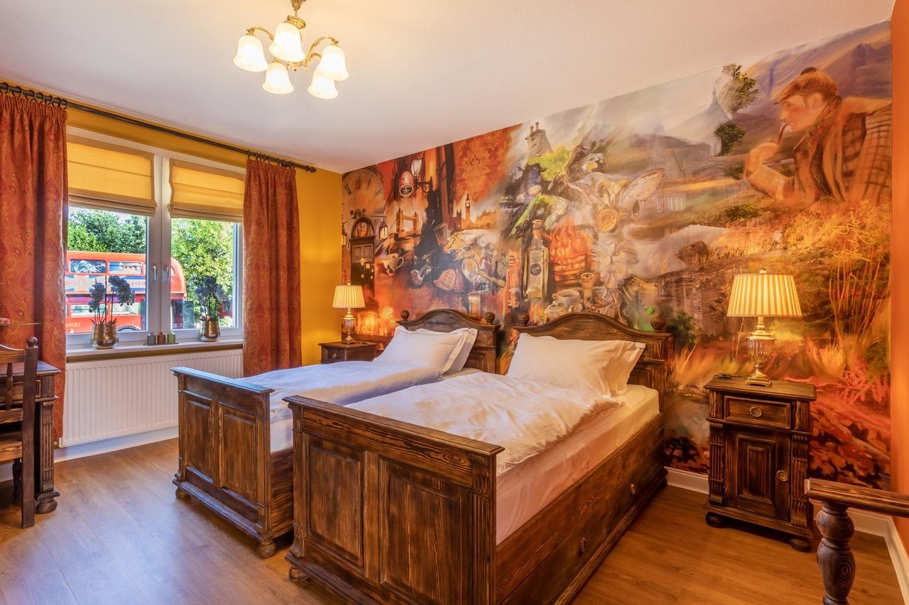 With great attention to detail, the team around owner Gary Blackburn has set up 12 themed rooms for you, which were imaginatively staged by the artist AndyMo. For example, you will find a "British Room", "Scottish Room", "Sherlock Holmes Room", "Cornish Room", "Queens Room", "Harry Potter Room", "Fairy Room" and a "Beach Hut Room". The rooms "Dinner for one", "Agatha Christie", "James Bond" and "Mr. Bean" are new additions. The large luxury holiday flat offers space for up to 10 people.
