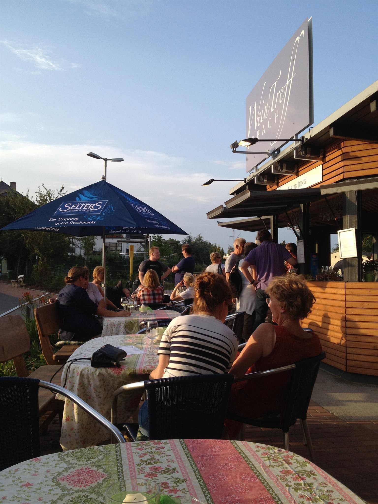 The Wine Treff is located at the entrance to Erbach, right next to a large parking lot, easily accessible from the federal highway 42 and the banks of the Rhine. There you will find an attractive wine stand with a modern ambiance. Seating is available directly at the stand as well as by the riverside. The nearby playground also makes it particularly appealing for families.