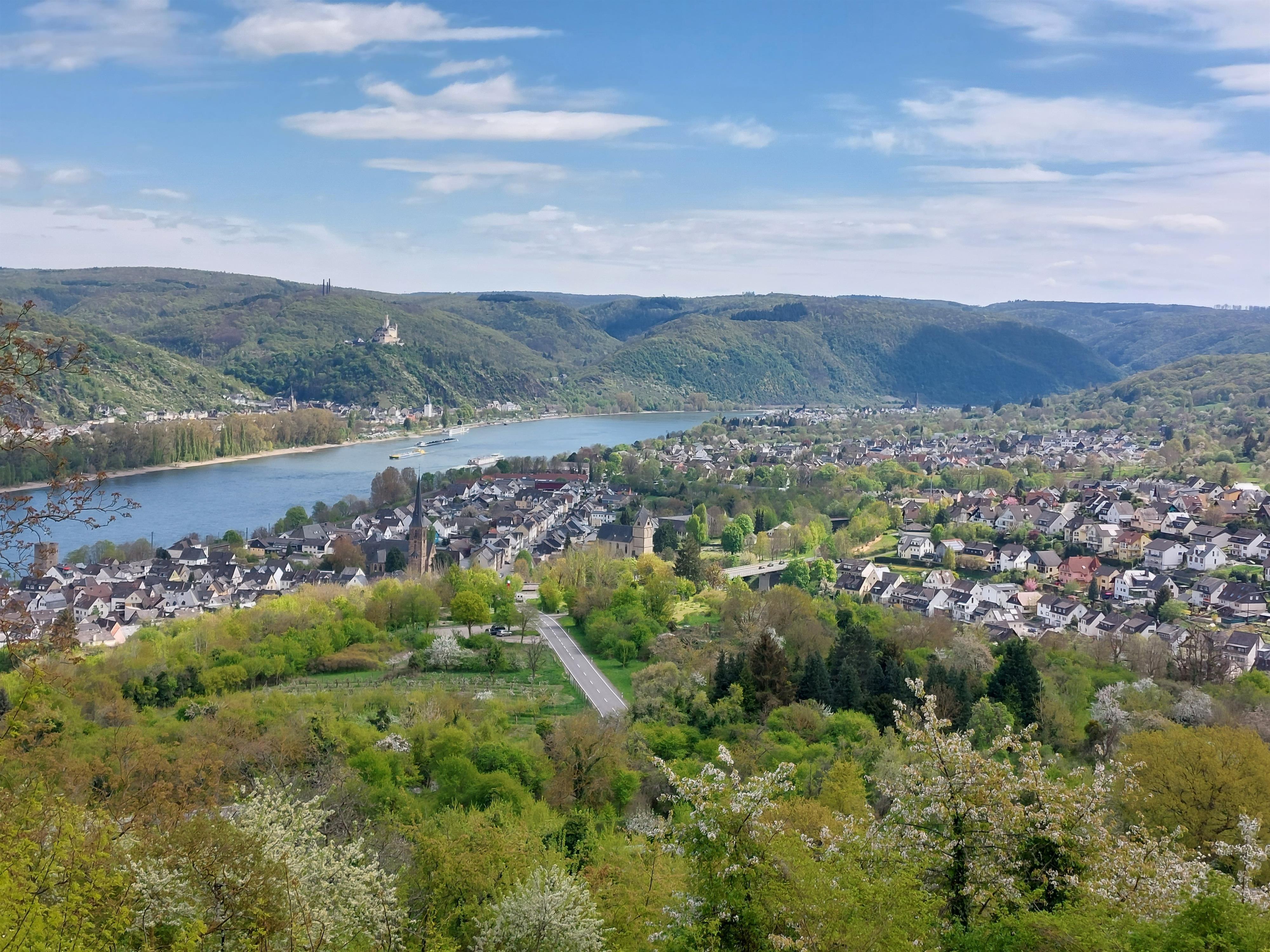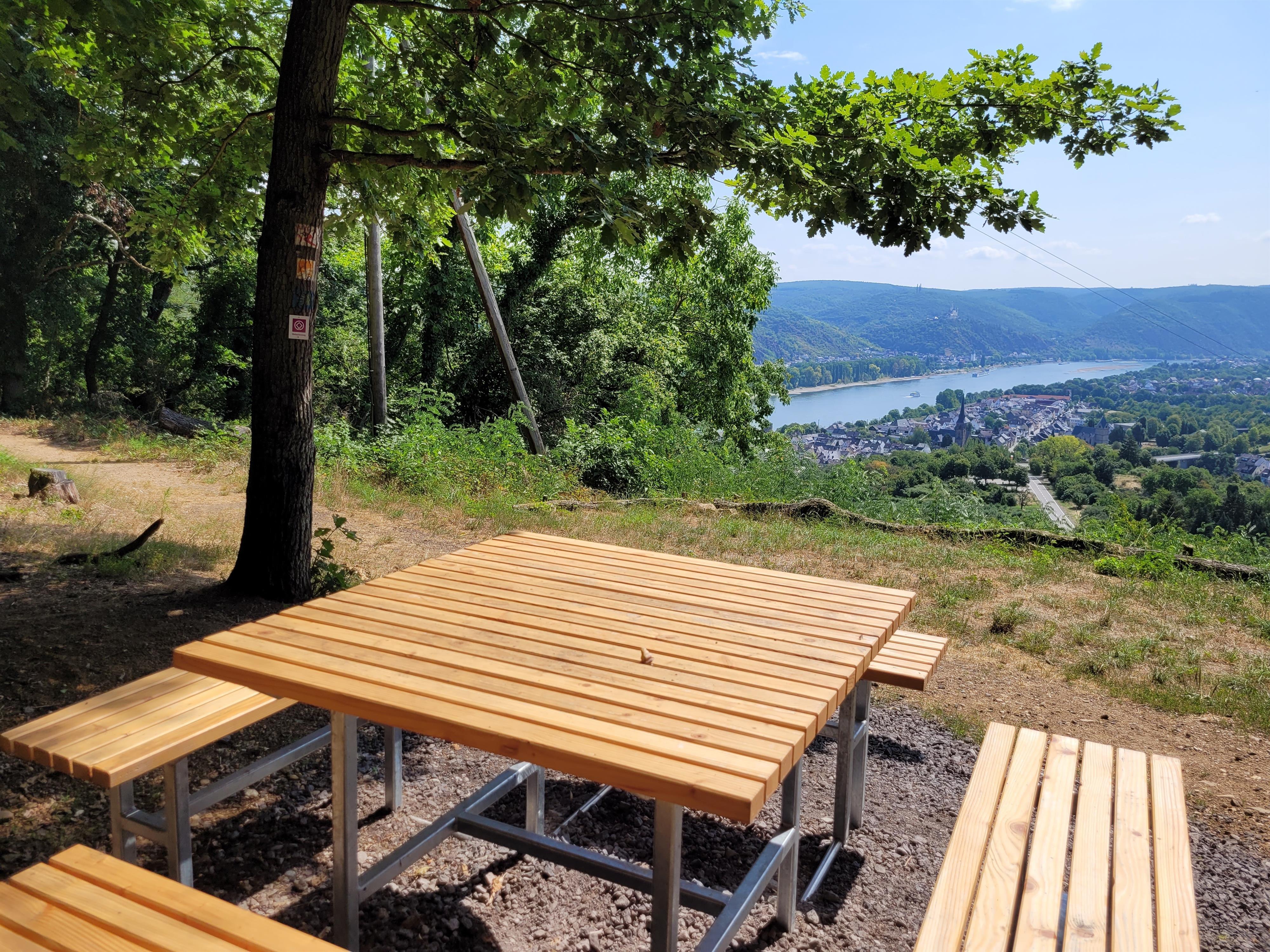 Het uitzichtpunt "Panoramablick Lützelforst" met een zit-statafel en een fantastisch uitzicht op de Königsstuhl, op Rhens, in het Rheinstal en de Marksburg bevindt zich aan de premium wandelroute "Traumpfad Wolfsdelle" in de directe nabijheid van de zendmast.