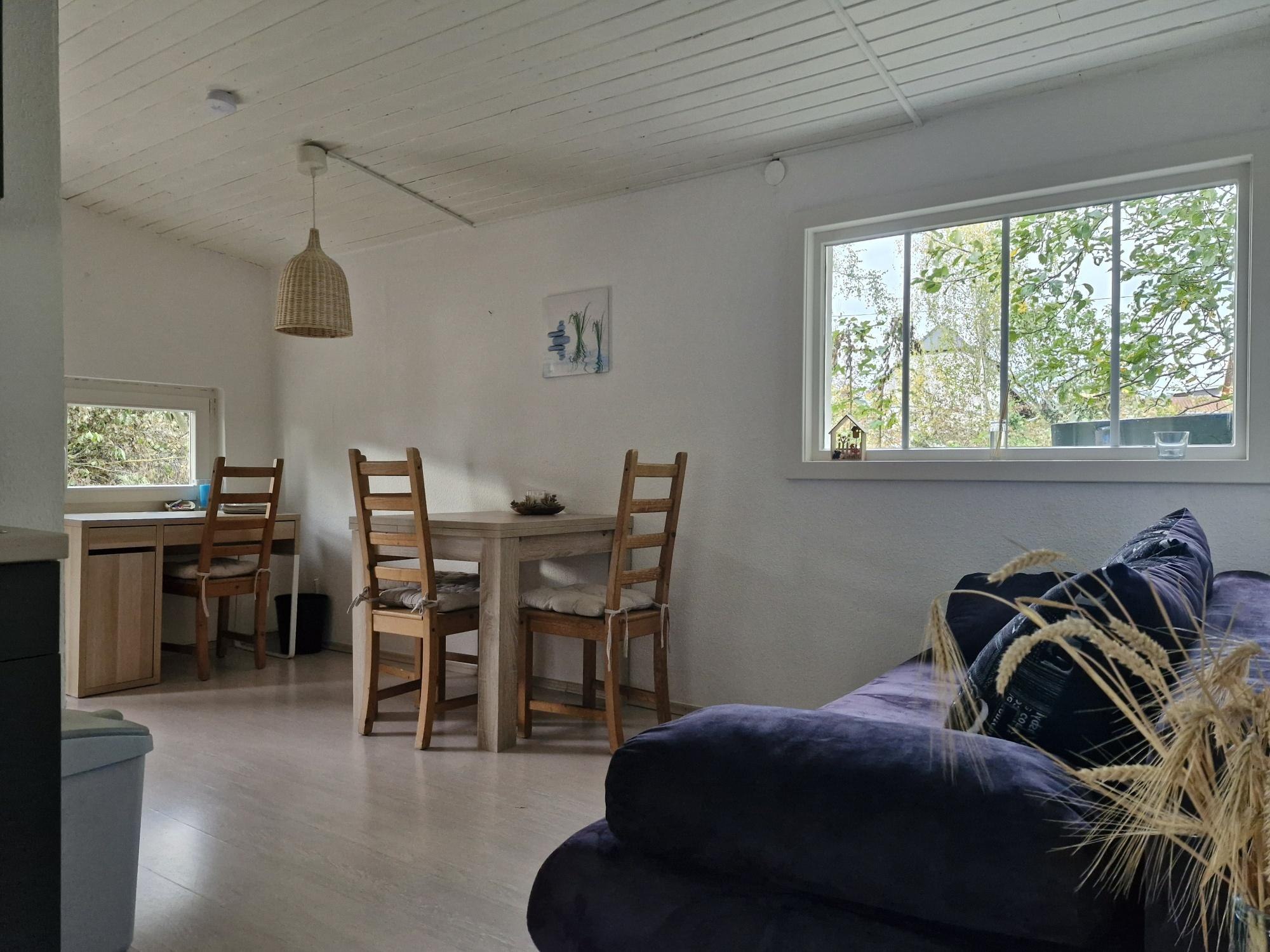 Het kleine, liefdevol ingerichte huisje ligt in de achtertuin omgeven door groen en is ongeveer 25 vierkante meter groot. Het huisje is gelijkvloers met uitzondering van 2 treden naar het slaapgedeelte en heeft een grote woon-eetkamer met slaapbank en een grote aparte slaapkamer. Het huisje is ontworpen voor 2 tot maximaal 3 gasten.