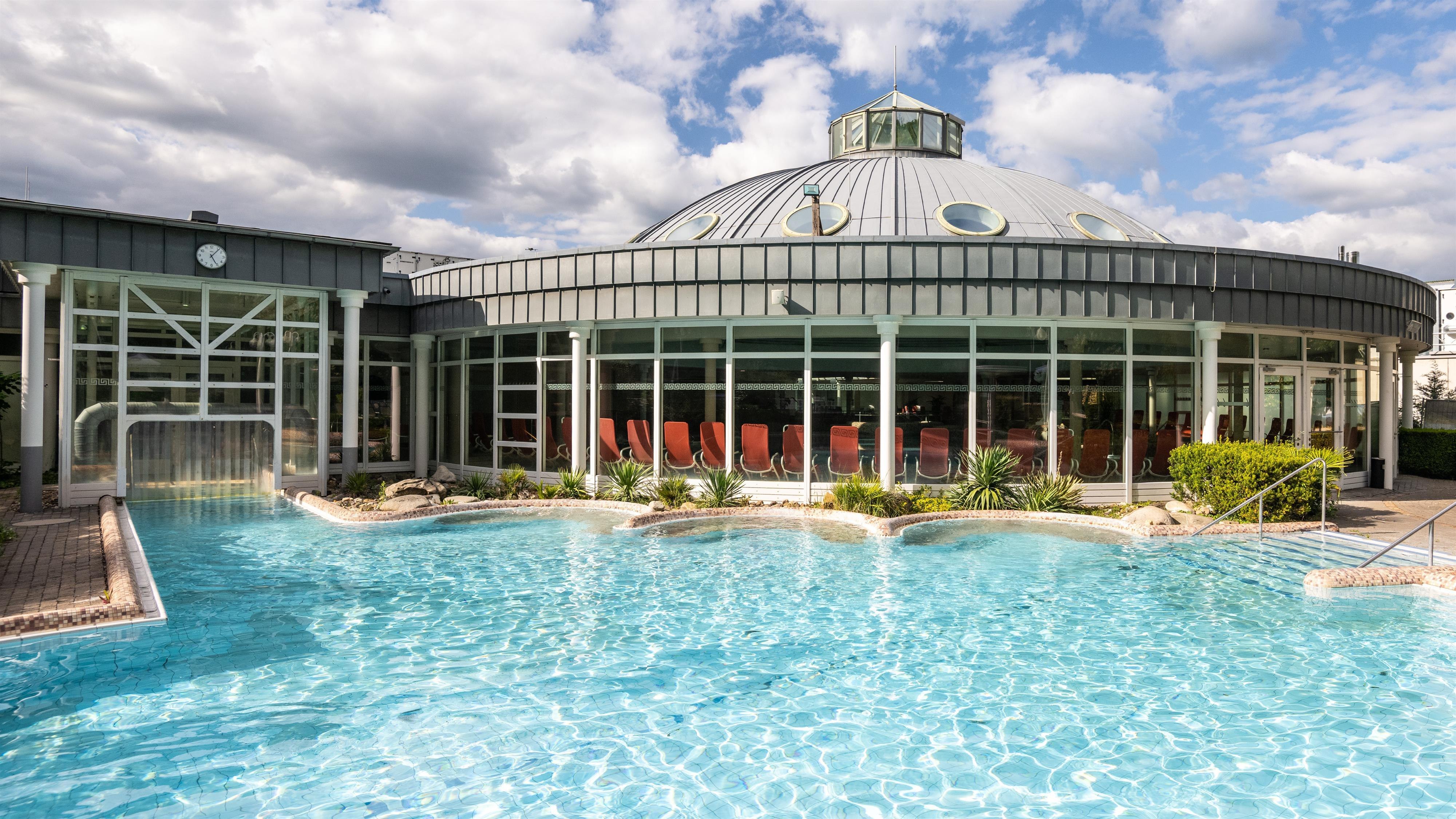 Hier kunt u water beleven! Geef uw lichaam iets goeds en laat het water in zijn verschillende vormen voelen: als warm mineralenwater binnen en buiten, als weldadige waterdamp in het (textiele) stoombad, door bruisende massagedouches en whirlpools, in het Kneipp-bassin, in het therapiebad of in de "Bruine Grot" met het natuurlijke mineralenwater. Een echte oase van welzijn voor de kleintjes is het kinderbad. En vergeet niet: in het thermale water moet u na ongeveer 30 minuten een rustpauze nemen.